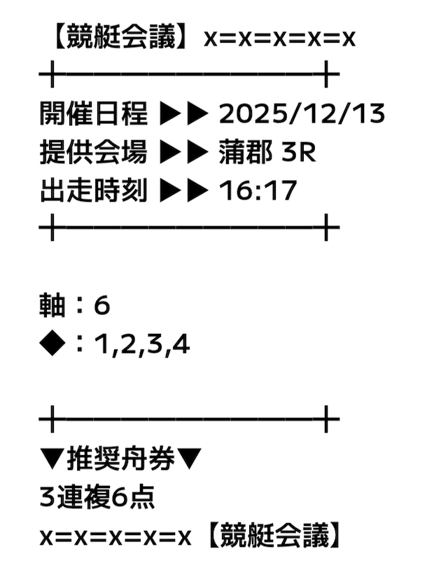 - 12月14日 蒲郡3R【買い目】三連複6-5-138.8倍38,800円 - 6,000円= 32,800円646.7%