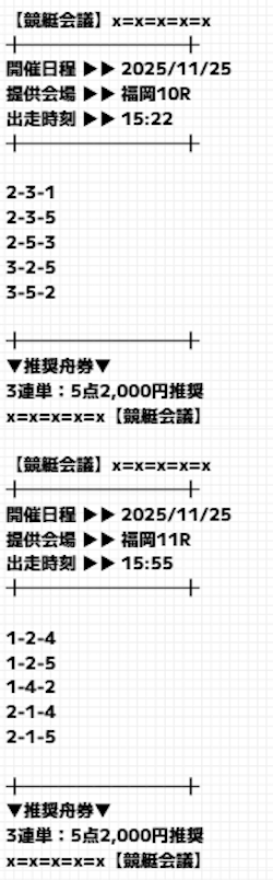 - 11/25 福岡10R三連複 6点2−5−3獲得金額33,800円投資金額6,000円33.8倍+27,800円