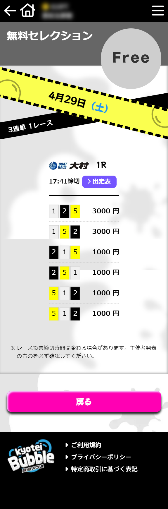 | 有料予想が 送られてこない | × | 有料プランを購入したが予想買い目が 時間になっても送られてこない。 そのあとサイトにアクセスできなくなった。 |