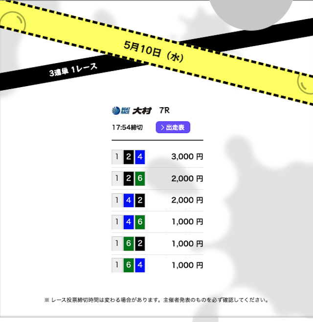 - 5月7日 津5R【買い目】三連単1-2-34.6倍16,100円 - 10,000円= 6,100円161%