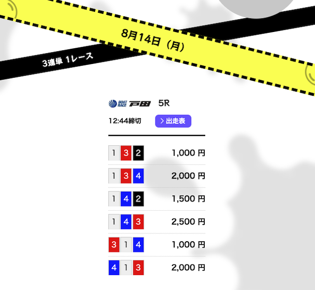 - 8月14日 戸田5R【買い目】三連単1-4-37.6倍19,000円 - 10,000円= 9,000円190%
