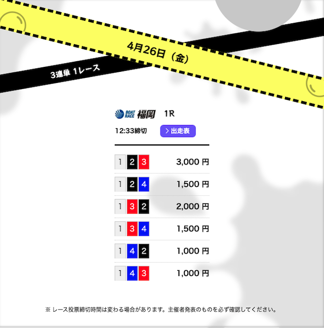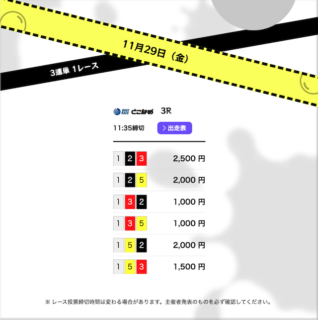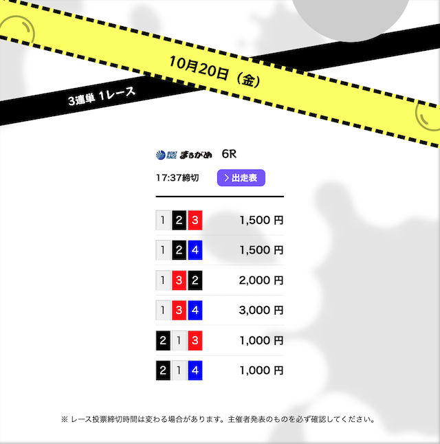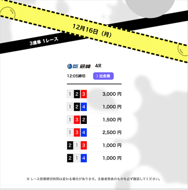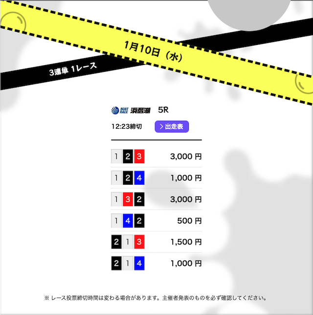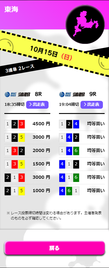 - 4月23日 常滑3R【買い目】三連単1-2-36.5倍22,750円 - 10,000円= 12,750円227.5%