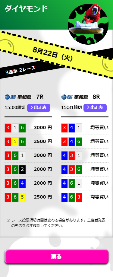 - 7月6日 平和島2R【買い目】三連単3-6-181.6倍0円 - 10,000円= -10,000円✕