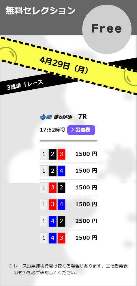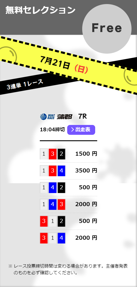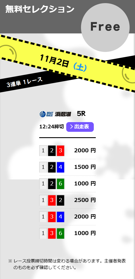 POINTポイント①.本命決着でも数万のプラスを出せる!ポイント②.一撃で帯まで見える有料予想!ポイント③.7点予想で連勝できる展開予想力!- コロ助昨日の無料が宮島で6万1200円の払い戻し出してくれて 今日11月27日は昼の無料が浜名湖で6万7200円、夜は蒲郡で31万5200円も無料情報が当ててくれた
