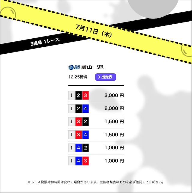 - 7月11日 津5R【買い目】三連単1-2-34.3倍12,900円 - 10,000円= 2,900円129%