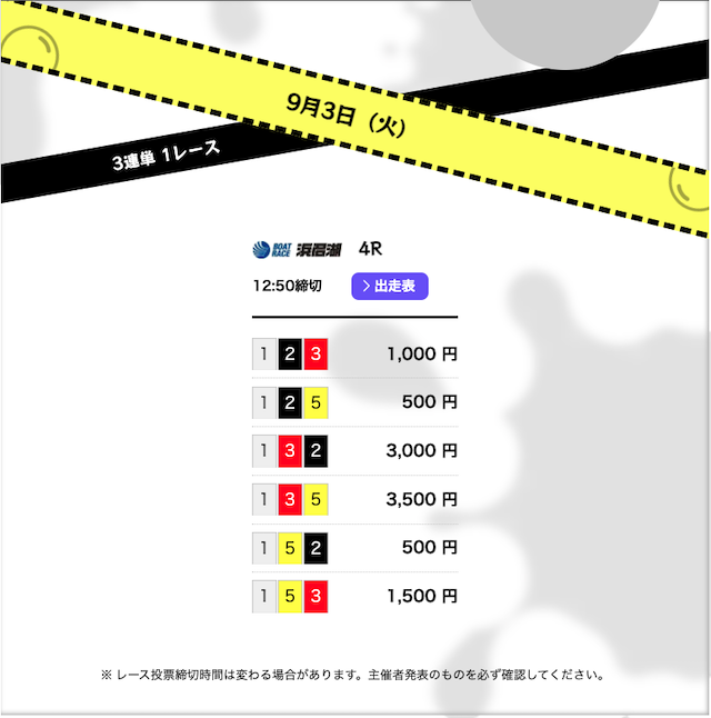 - 8月24日 児島3R【買い目】三連単1-2-315倍37,500円 - 10,000円= 27,500円375%