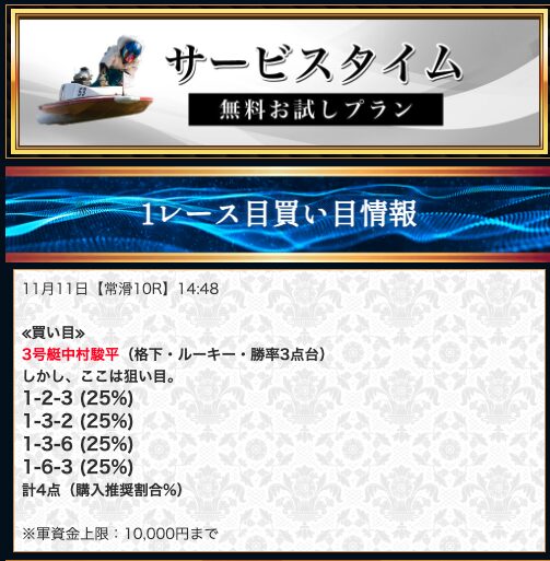・投資金額の10倍のリターンが期待できる ・コロガシが4回に3回成功する このように、競艇セントラルはとんでもない情報を販売しています! 軍資金がある方は、迷わず有料予想で勝負! | |