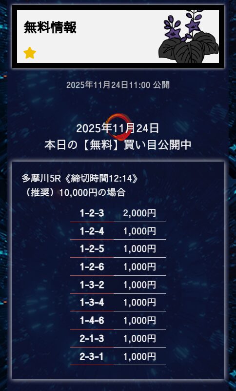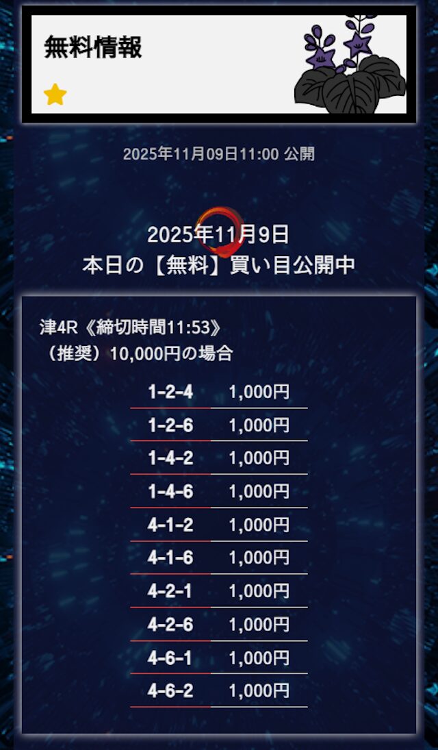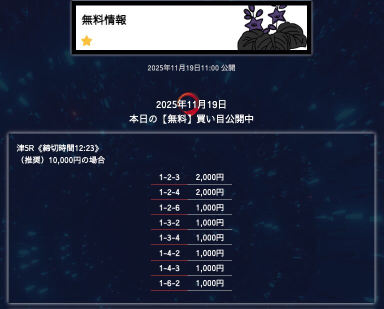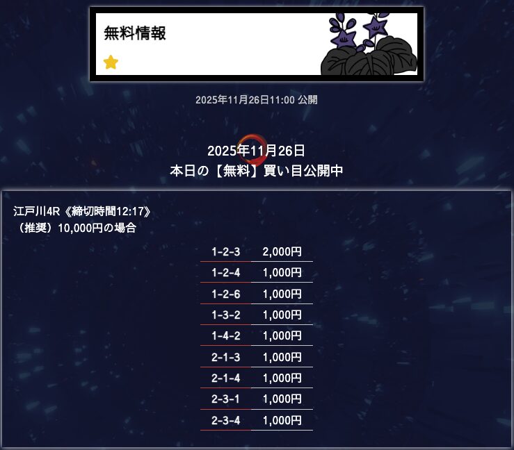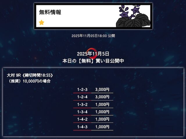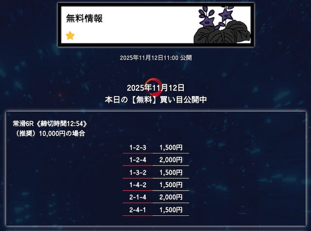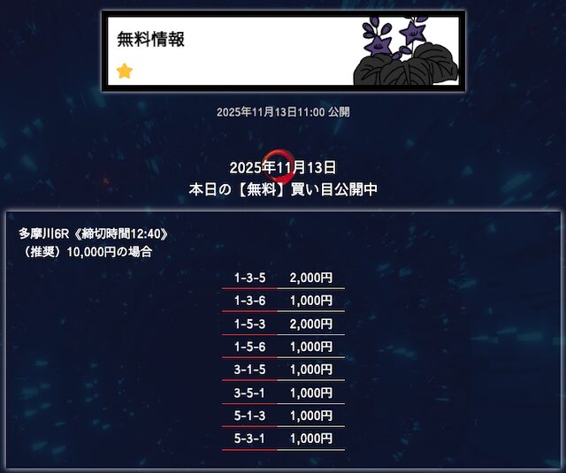 無料予想は堅実、穴が狙えたら狙うって感じかな。オッズが10倍を切ることもあるけど資金分配してくれているから払い戻しの面は気にならない。もう少し高配当が飛び出たら星5評価だけどそれは求めすぎかw