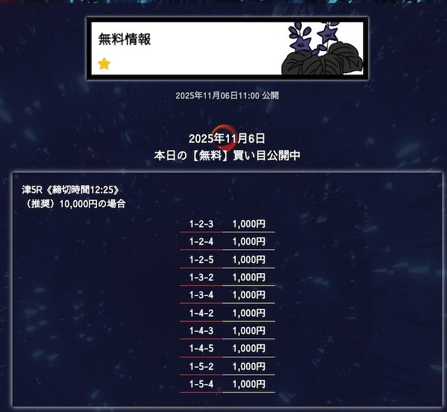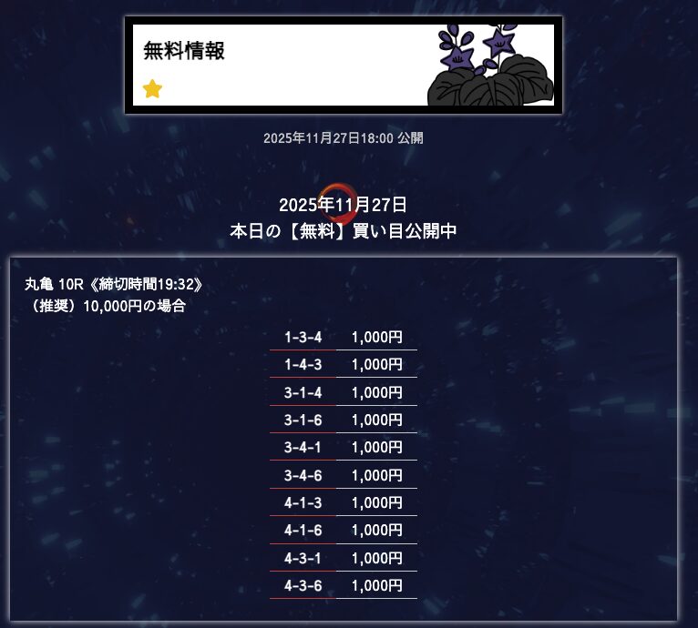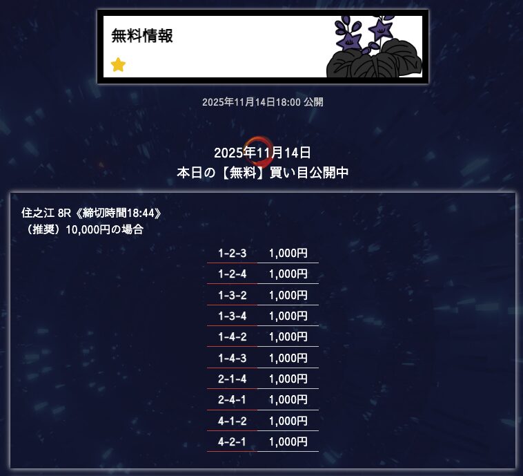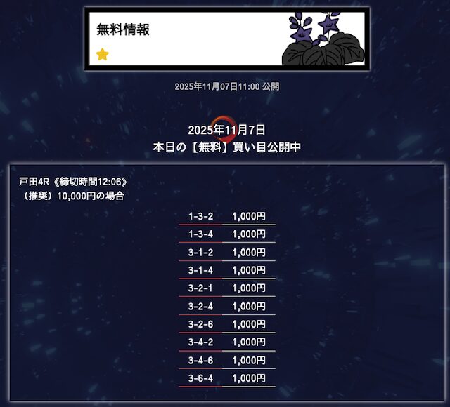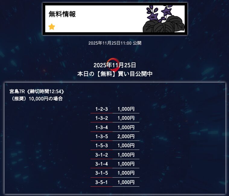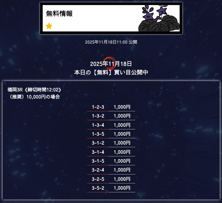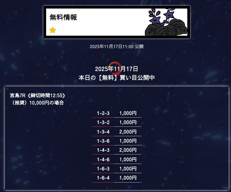 無料予想は堅実、穴が狙えたら狙うって感じかな。オッズが10倍を切ることもあるけど資金分配してくれているから払い戻しの面は気にならない。もう少し高配当が飛び出たら星5評価だけどそれは求めすぎかw