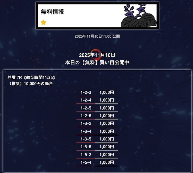 1日に無料予想が2レース受け取れるのはでかい。しかもその予想が当たるから尚更。自分の予想で勝つのも良いけど、分析の手間暇かけずに完全に任せた上で勝つのも悪くない