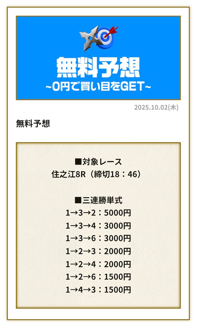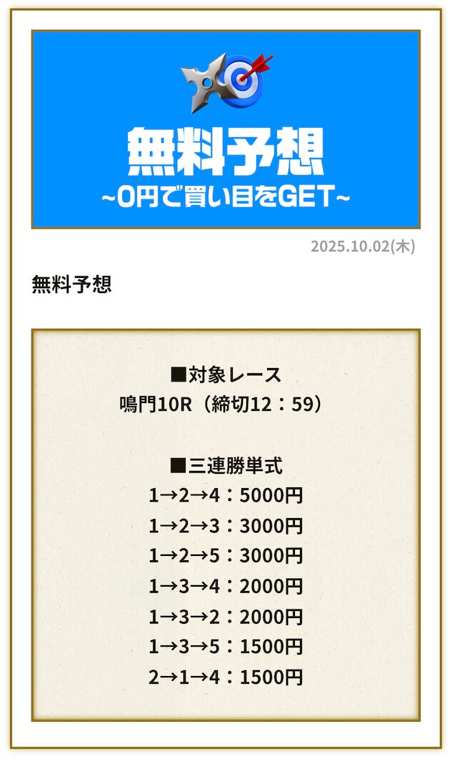 無料予想の的中率を見るに2レース連続で当てることはできなくはなさそうですが、90万円目標ともなればそれなりに配当がつくような難しいレースでの勝負もあるはずです。