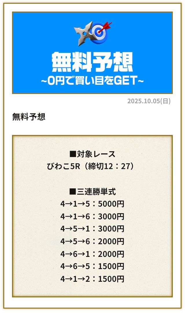 このレースが外れるなら本当に意味不明ですが、逆にこのレースをこの5点で当てるなんてことがあるなら、競艇ニンジャの予想力は本物。