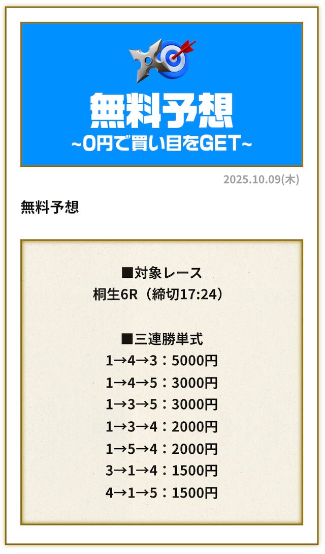 ◯ | 実際に購入した有料予想の 的中結果がそのまま掲載されていた |