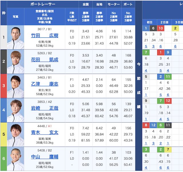 その他の選手を見てみると、1・2号艇は調子が悪そうでインコースからでも良くて1号艇が舟券に絡めるかといったところ。