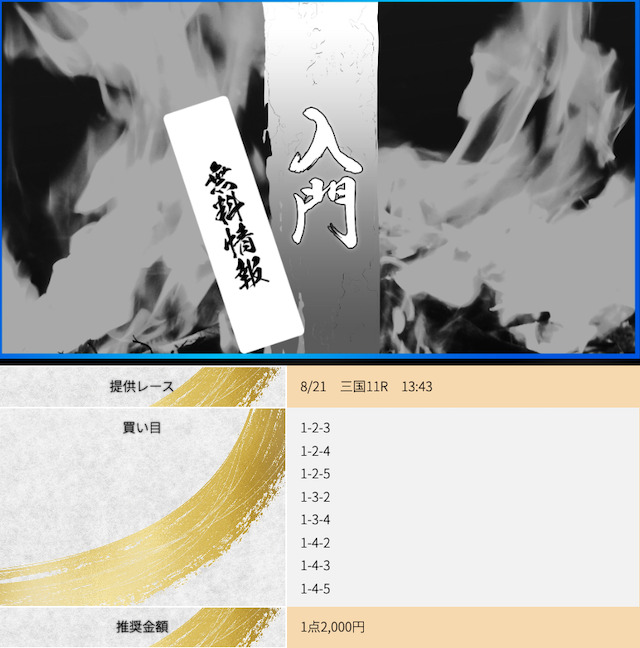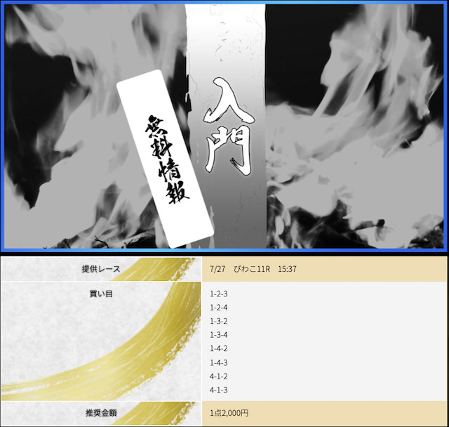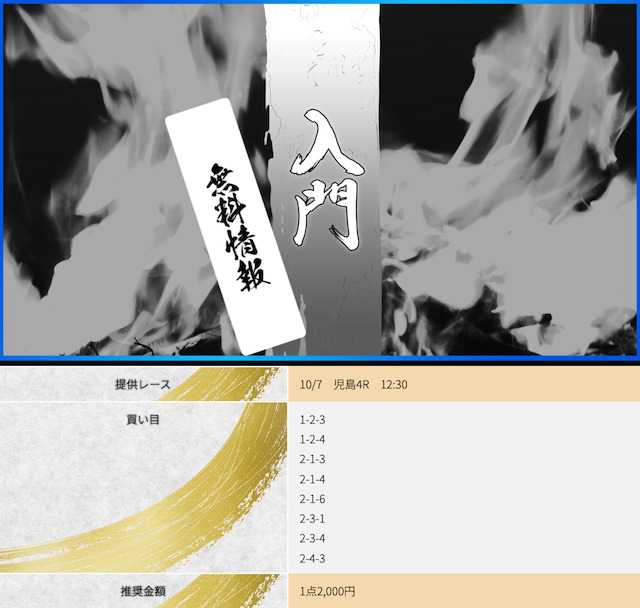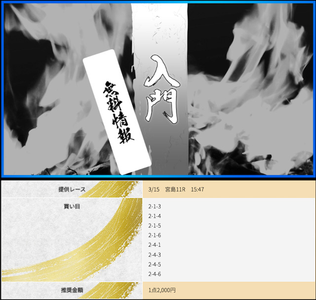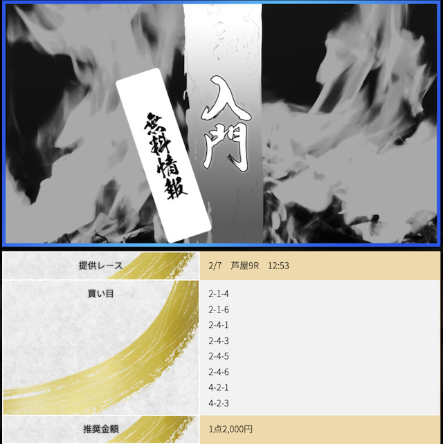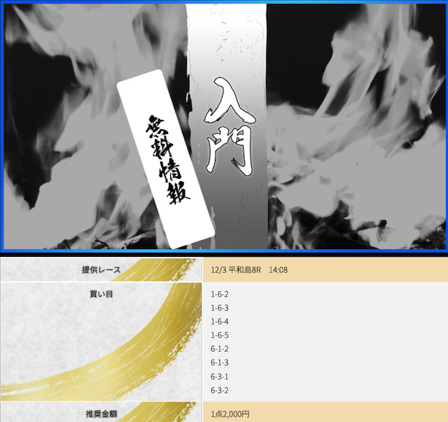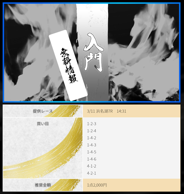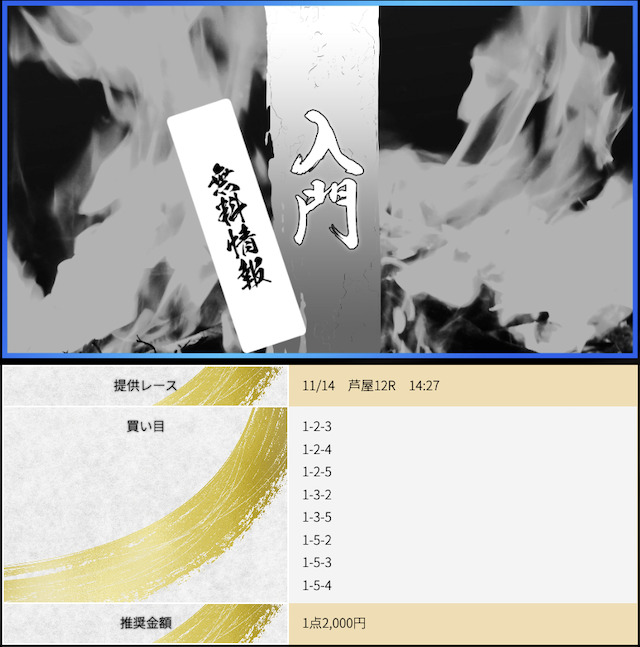 POINTポイント①.本命決着でも数万のプラスを出せる!ポイント②.一撃で帯まで見える有料予想!ポイント③.7点予想で連勝できる展開予想力!- コロ助昨日の無料が宮島で6万1200円の払い戻し出してくれて 今日11月27日は昼の無料が浜名湖で6万7200円、夜は蒲郡で31万5200円も無料情報が当ててくれた
