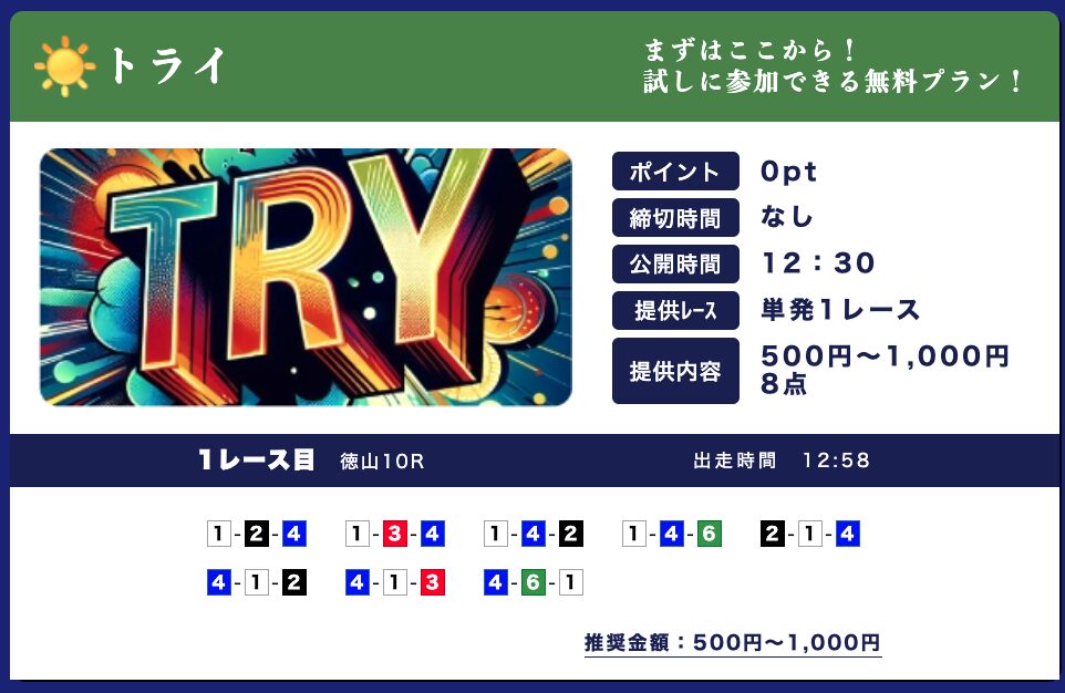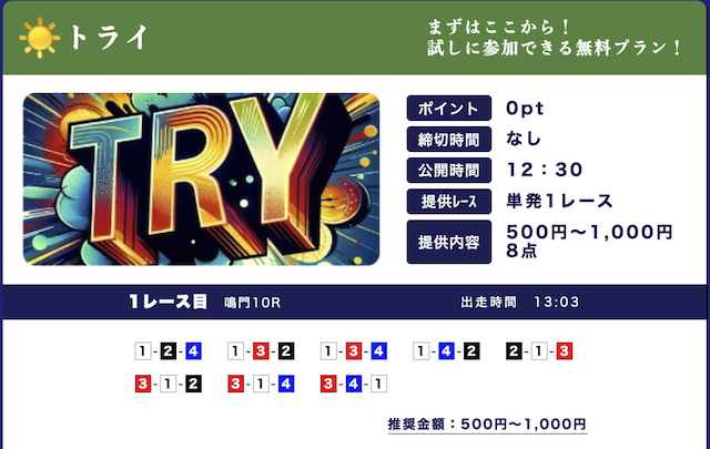 初めてのサイトです!かなり期待はしていまして、初戦から勝ちスタート!ただ3戦して1勝2敗で3,000円マイナス喰らいました。でもそこから2連勝でプラス1万まで回復してます!一応プラスなので、これからの期待も含めて4点!