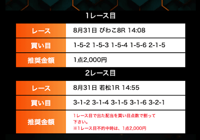 | 8月31日 | びわこ8R | 250,000円 | 10,000円 | 273,200円 | ◯ |