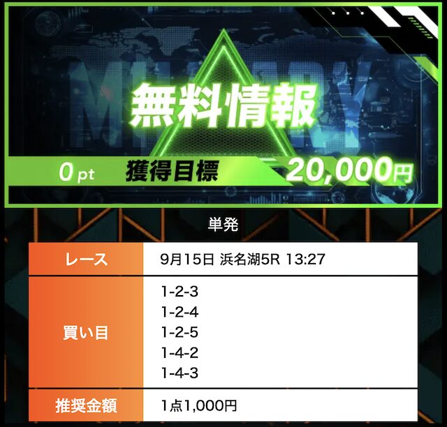 情報料金が高いため、いきなり参加するのは厳しいと思うので、無料予想の払戻金や安めの有料予想で獲得した払戻金を使えば購入できます。