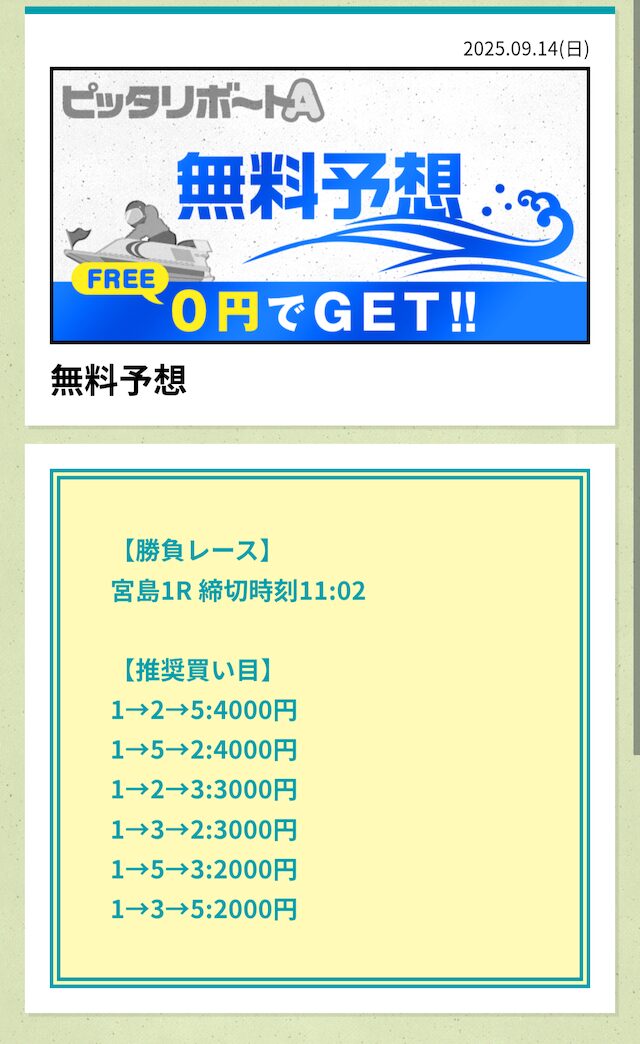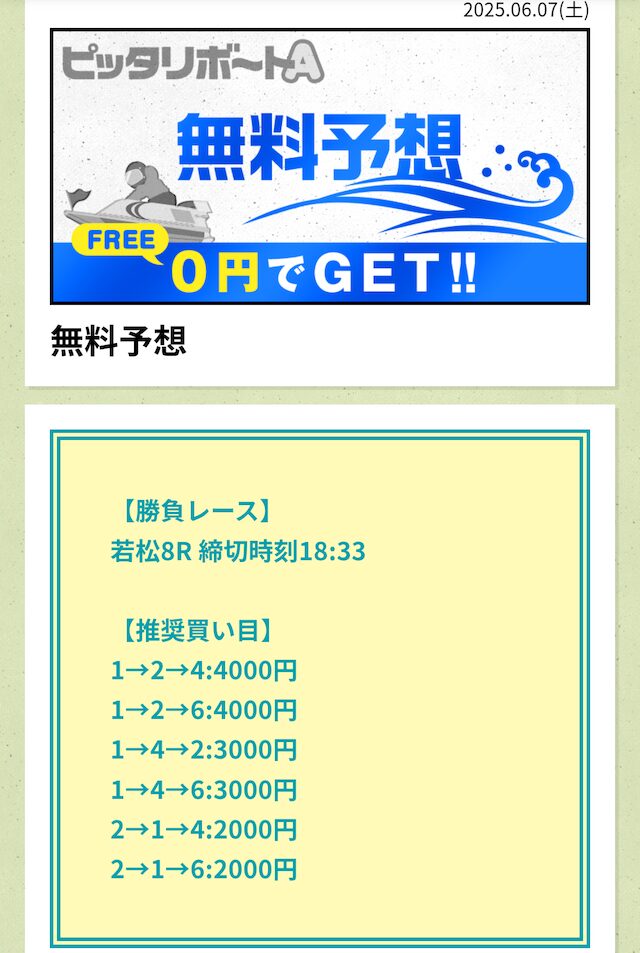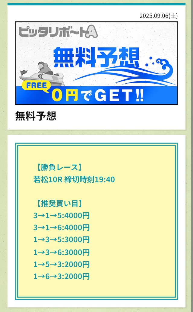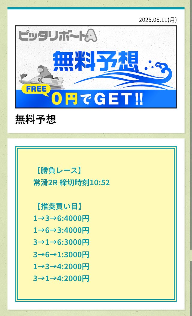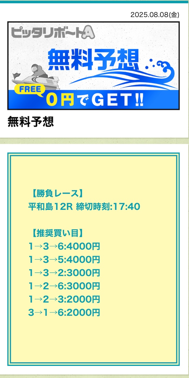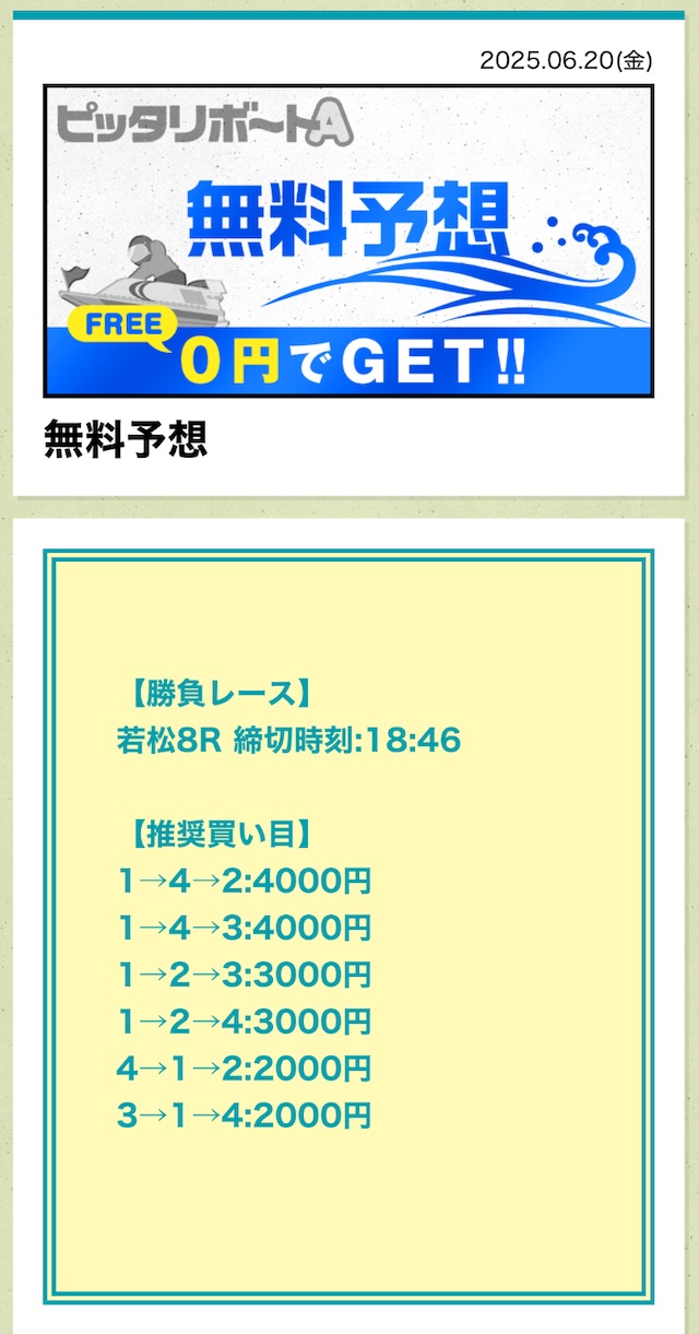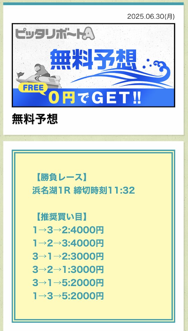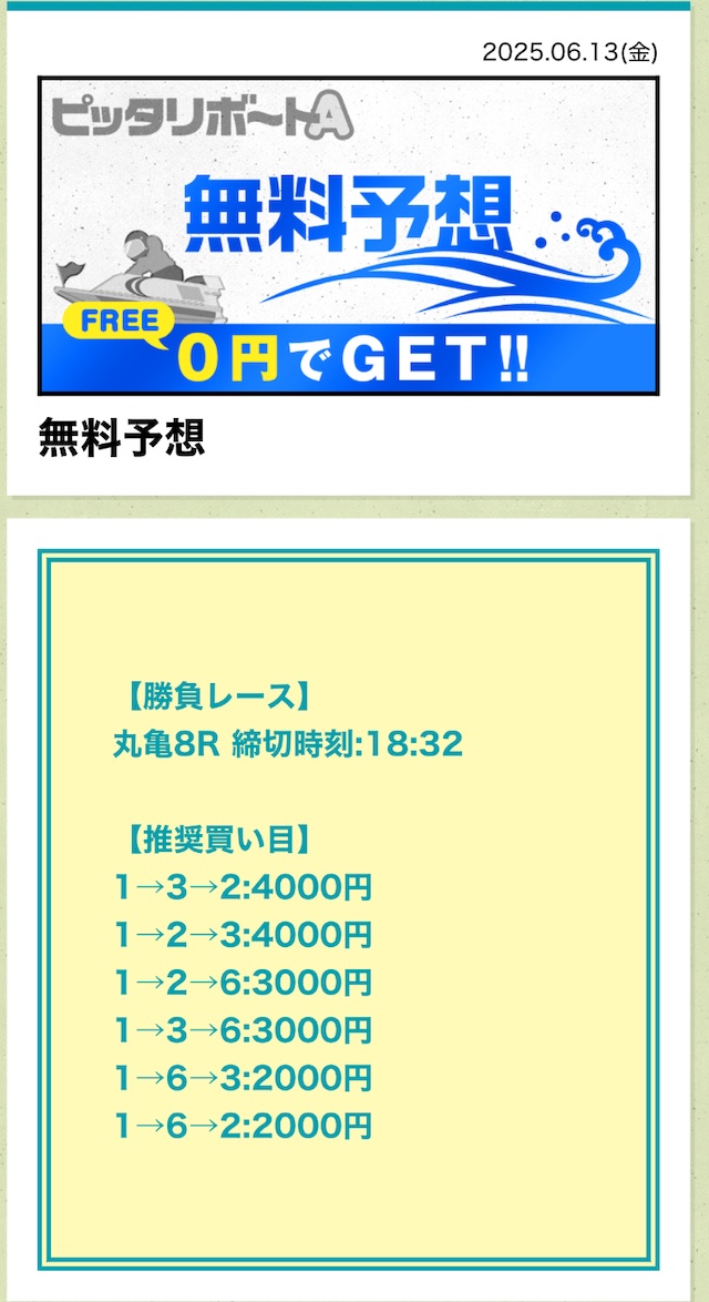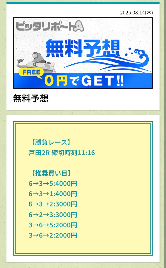 最近で一番回収できたのがここの無料予想。直前配信だから展示や気配も反映されてるし、3連単6点構成で買いやすい。1号艇決着だけじゃなく2号艇絡みも拾えてて、トリガミもなし。3日で+18,000円だった。