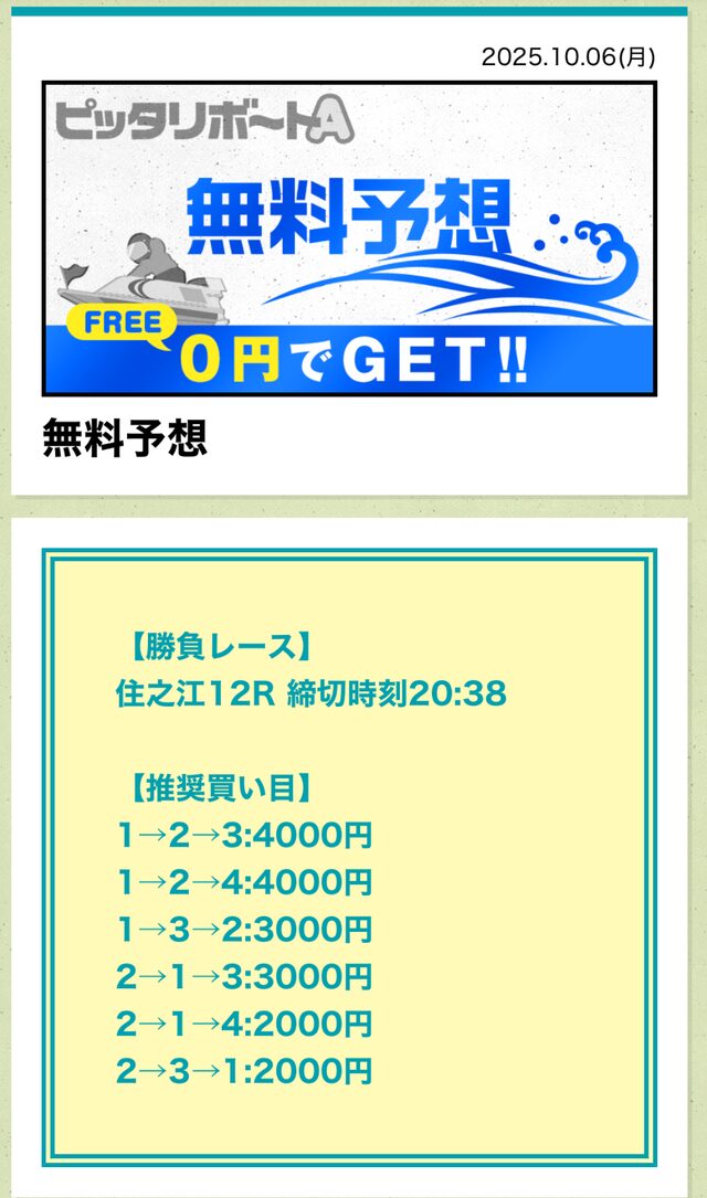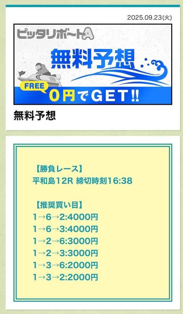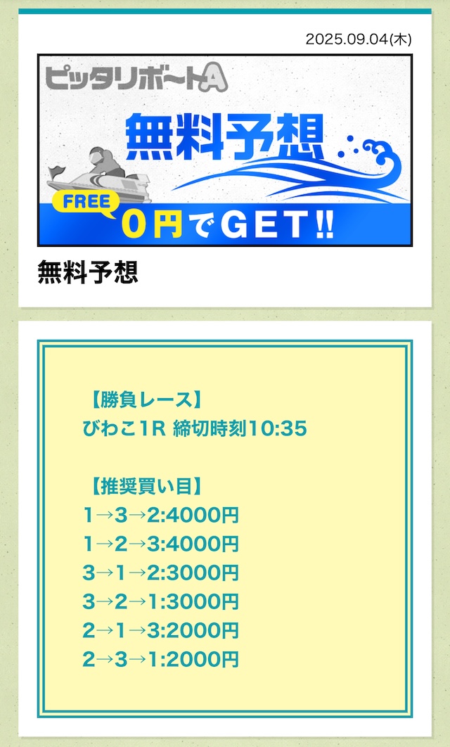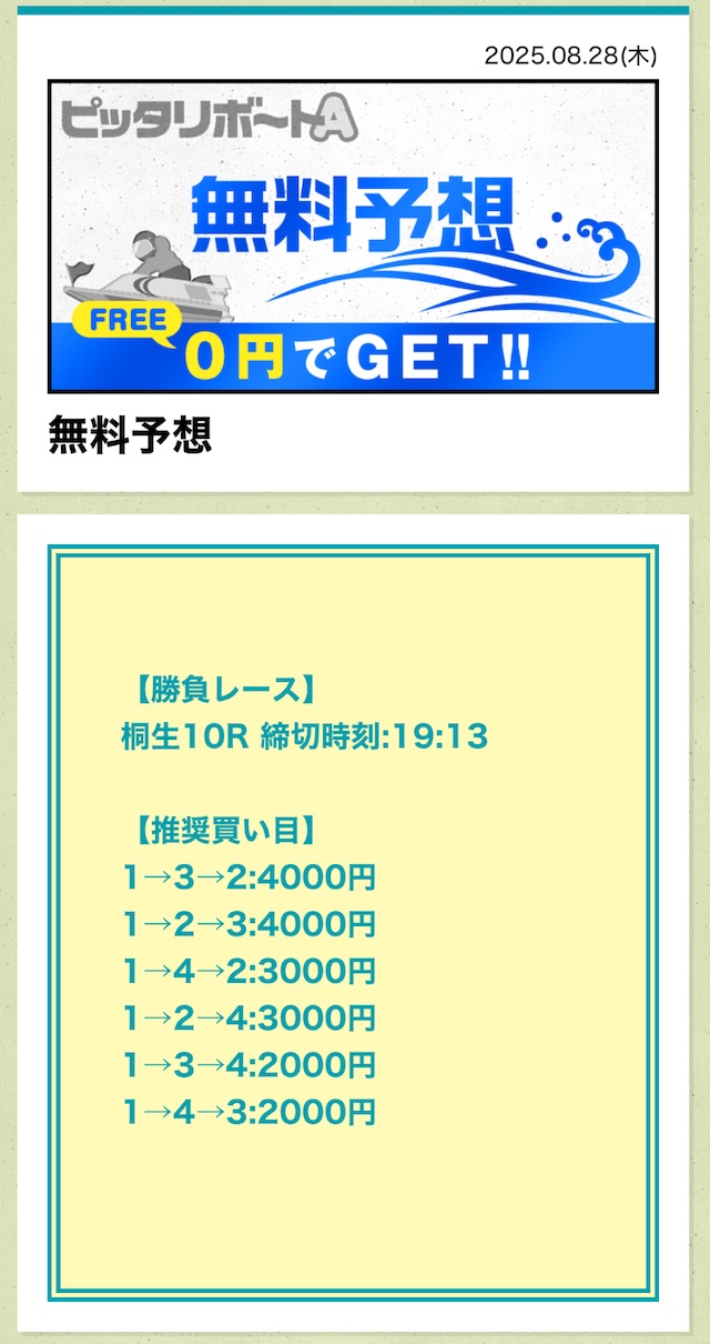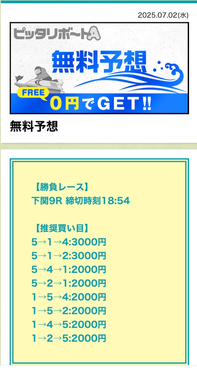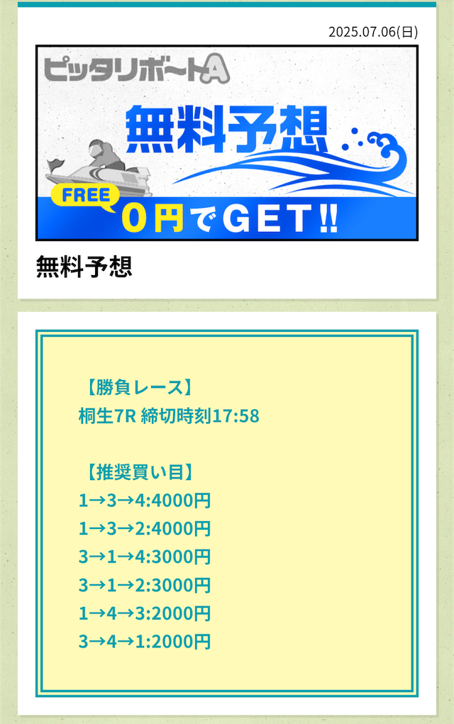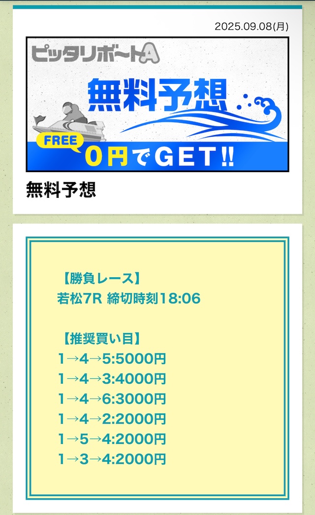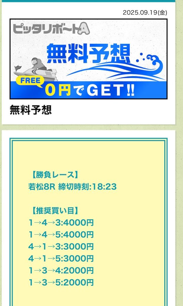 最近で一番回収できたのがここの無料予想。直前配信だから展示や気配も反映されてるし、3連単6点構成で買いやすい。1号艇決着だけじゃなく2号艇絡みも拾えてて、トリガミもなし。3日で+18,000円だった。