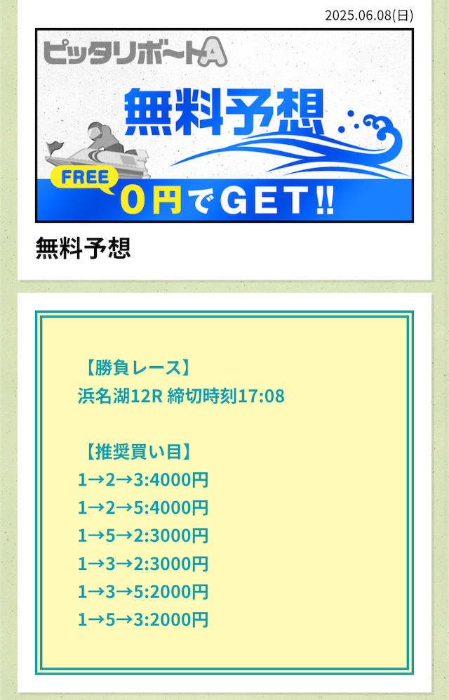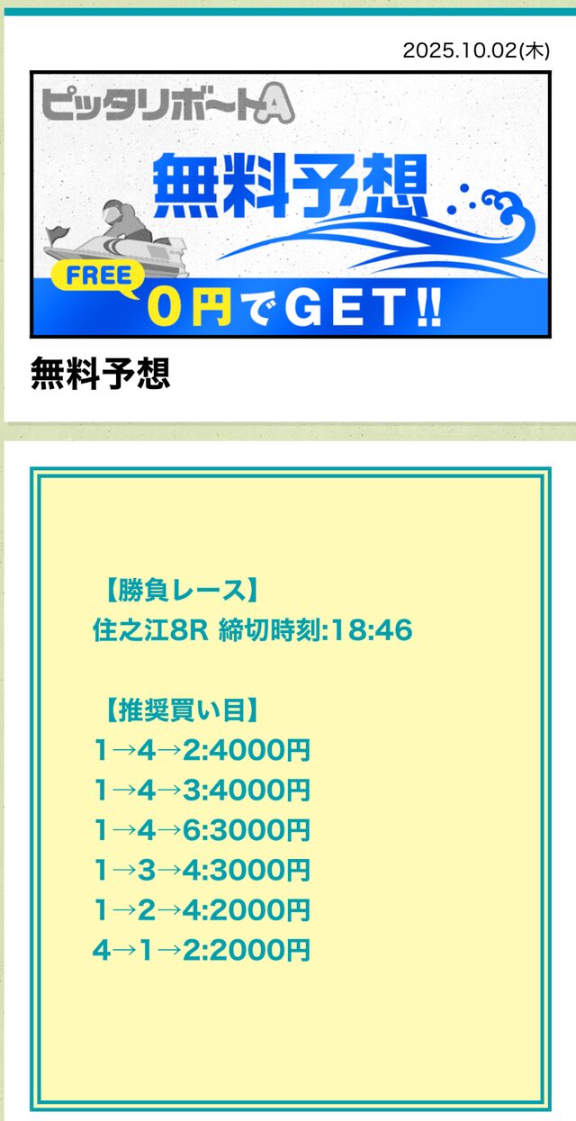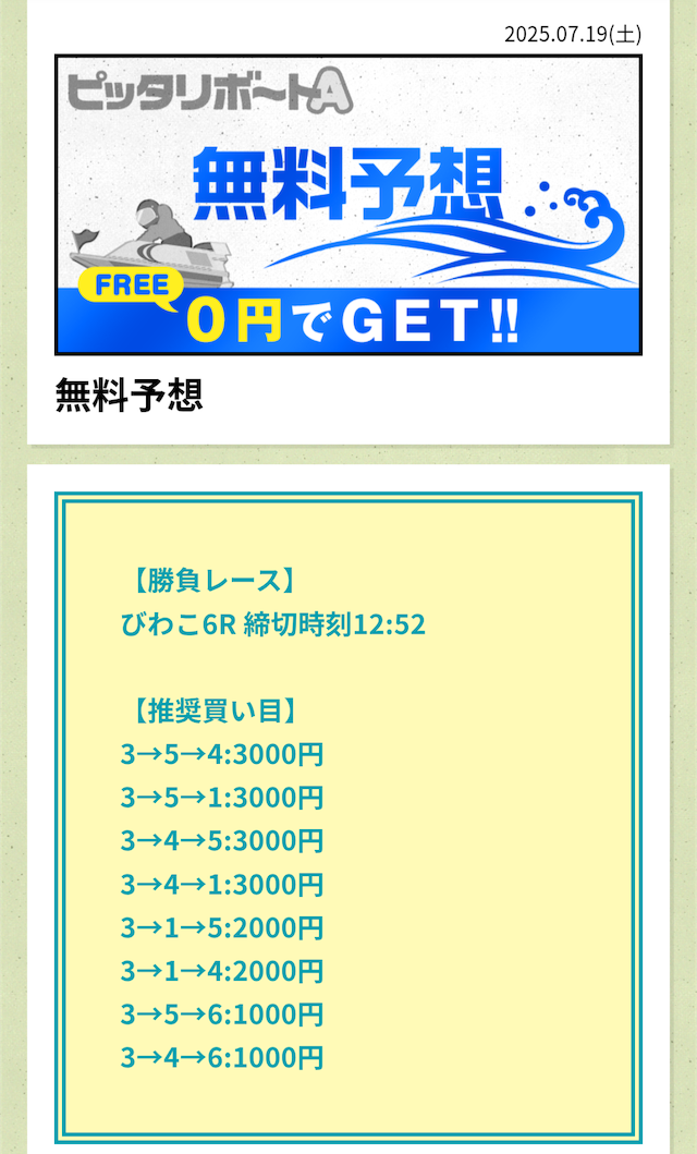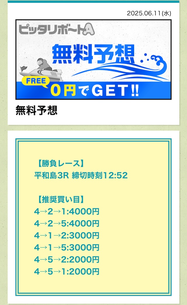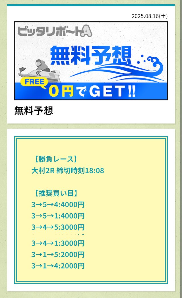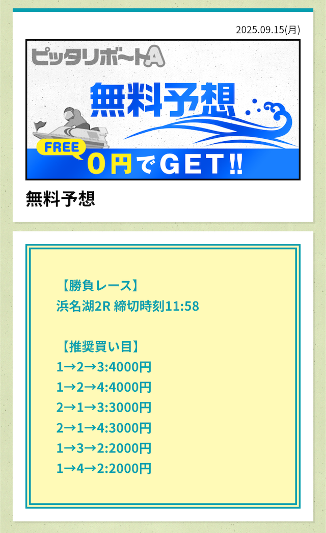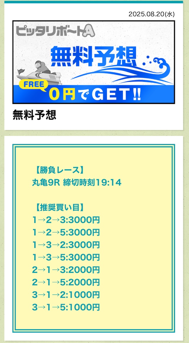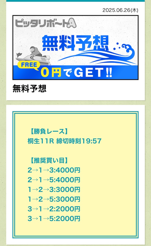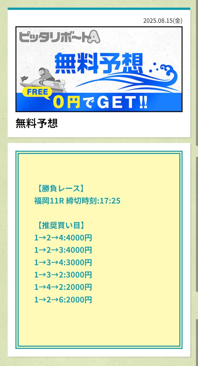 最近で一番回収できたのがここの無料予想。直前配信だから展示や気配も反映されてるし、3連単6点構成で買いやすい。1号艇決着だけじゃなく2号艇絡みも拾えてて、トリガミもなし。3日で+18,000円だった。