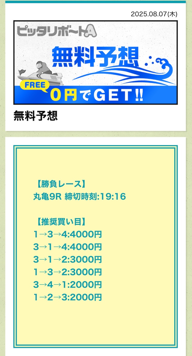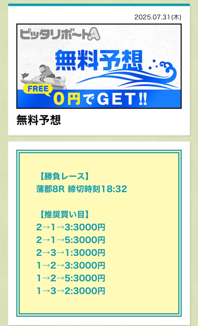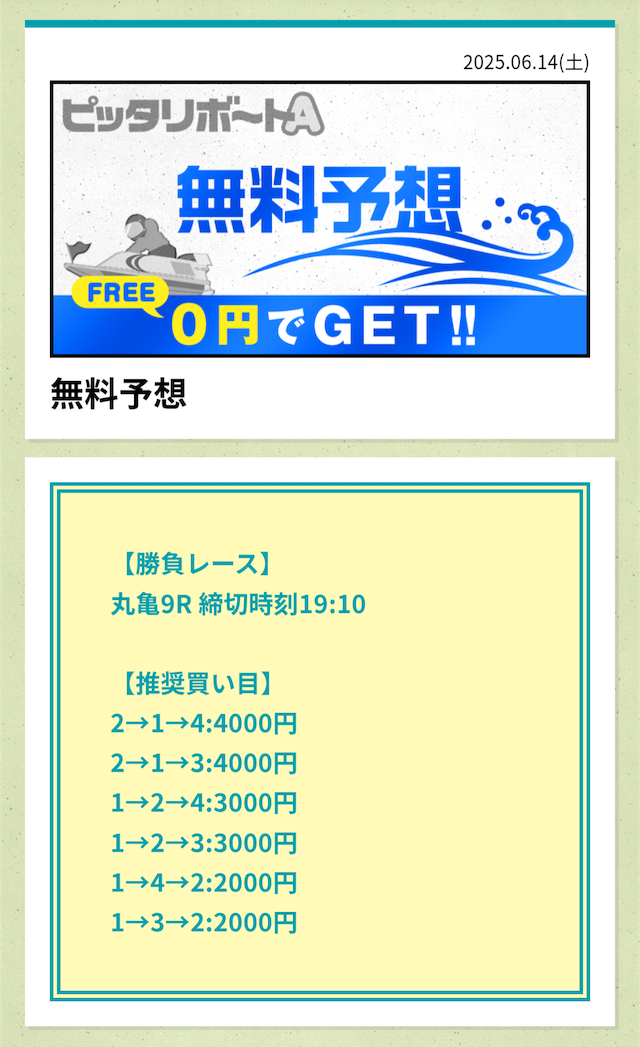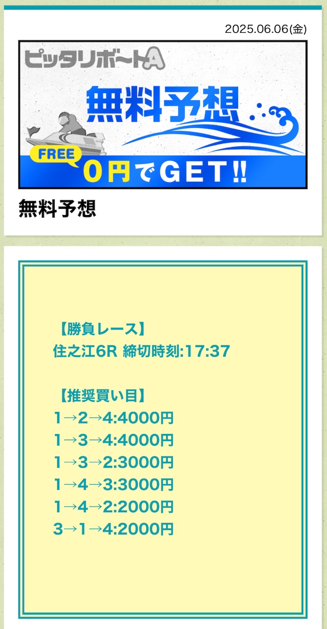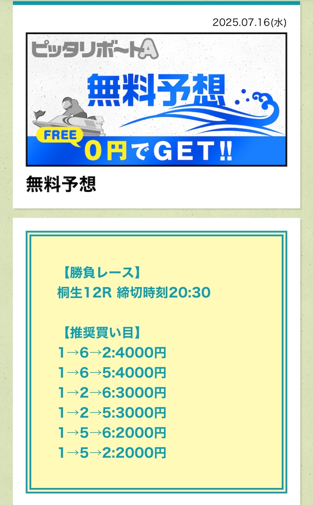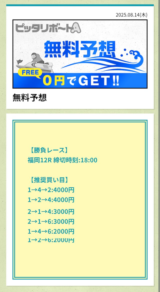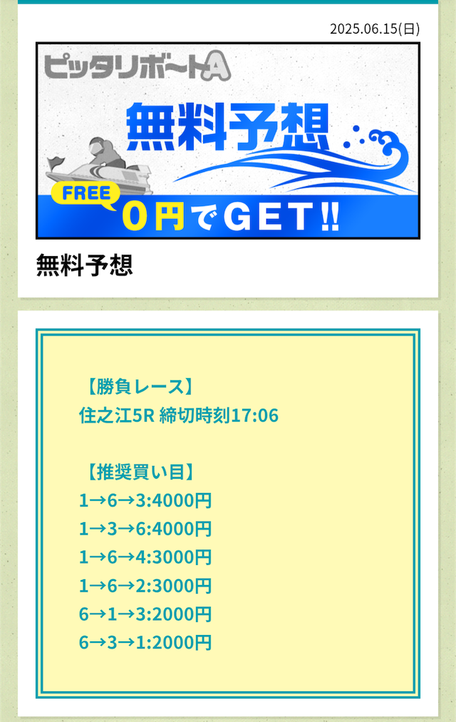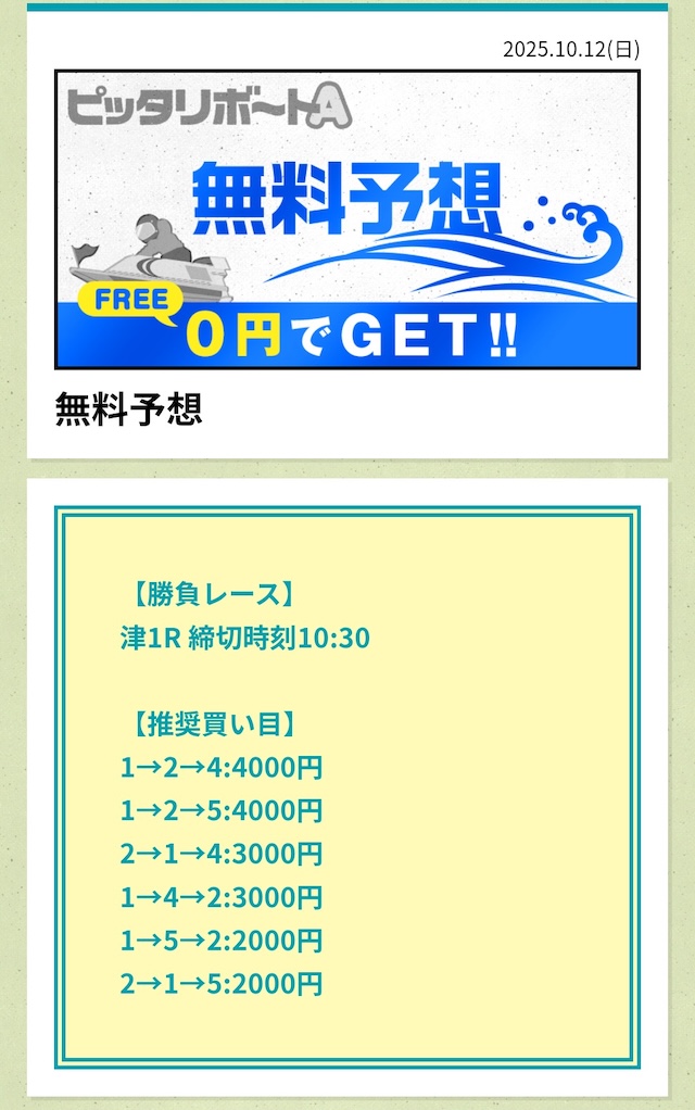 最近で一番回収できたのがここの無料予想。直前配信だから展示や気配も反映されてるし、3連単6点構成で買いやすい。1号艇決着だけじゃなく2号艇絡みも拾えてて、トリガミもなし。3日で+18,000円だった。