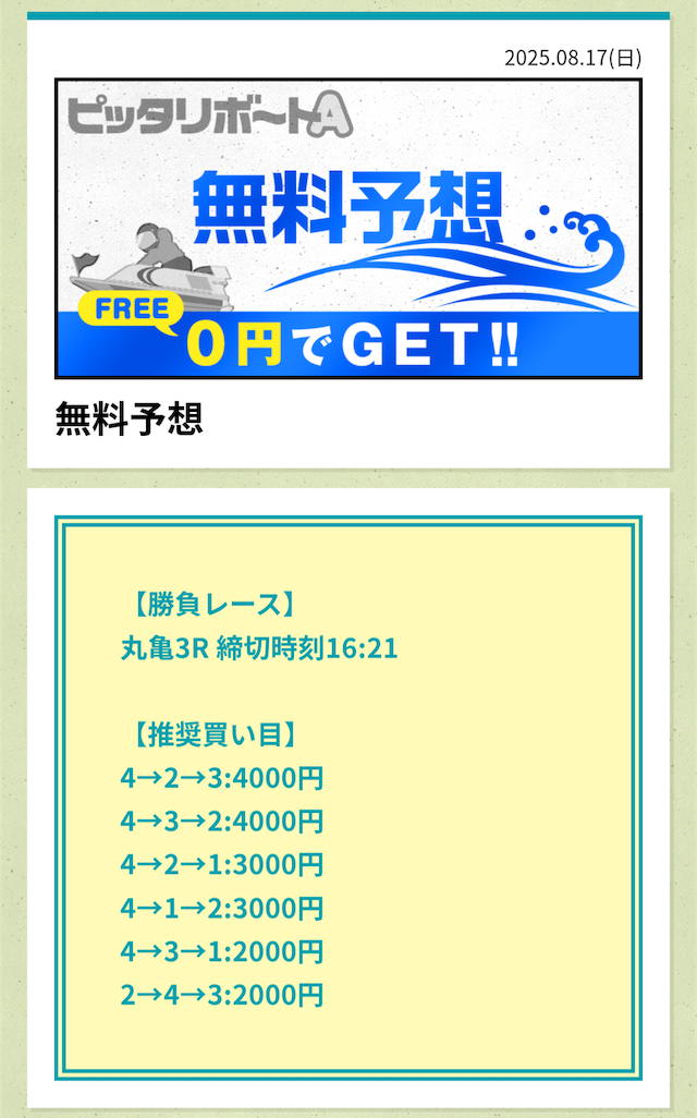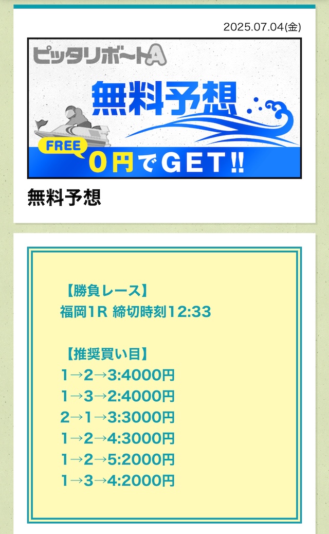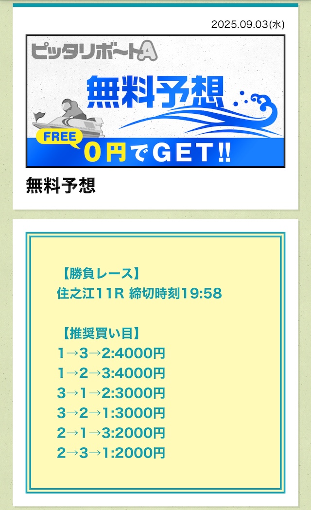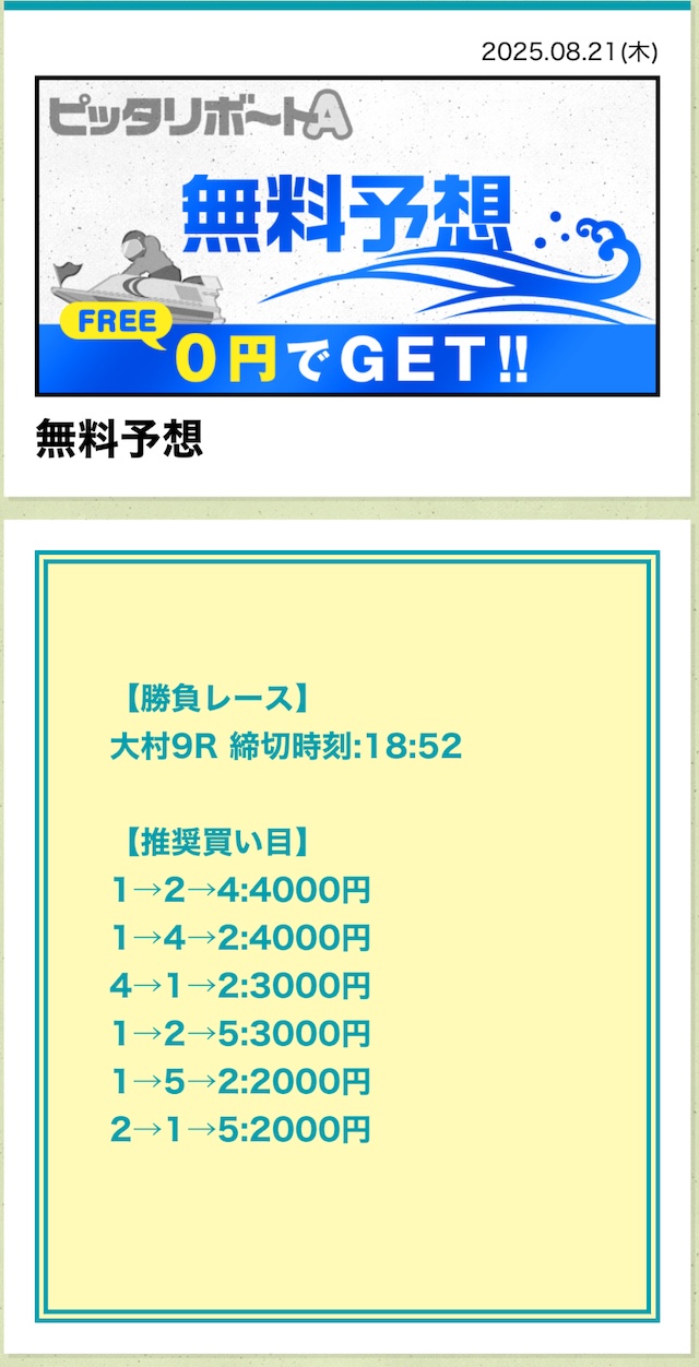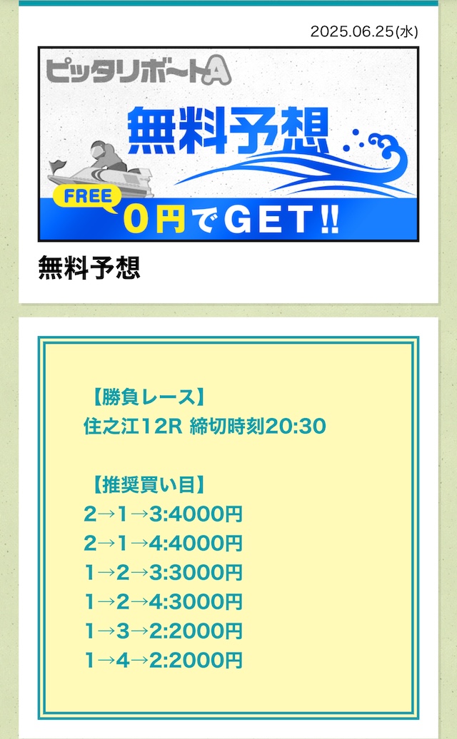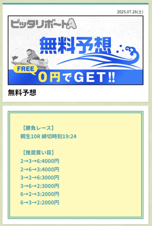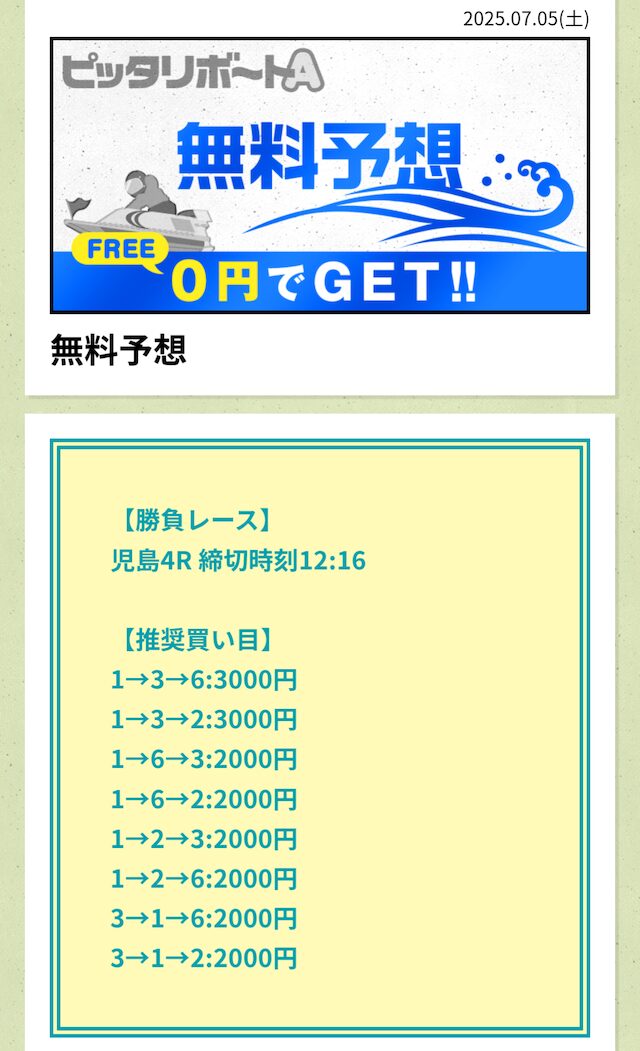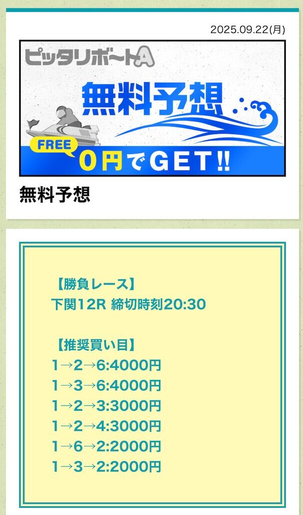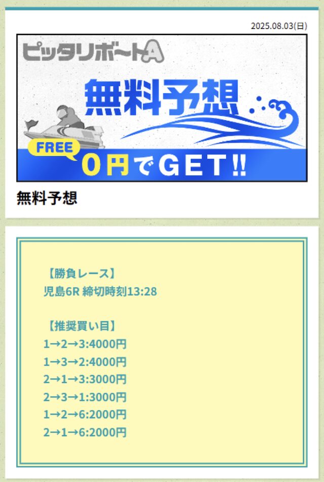 最近で一番回収できたのがここの無料予想。直前配信だから展示や気配も反映されてるし、3連単6点構成で買いやすい。1号艇決着だけじゃなく2号艇絡みも拾えてて、トリガミもなし。3日で+18,000円だった。