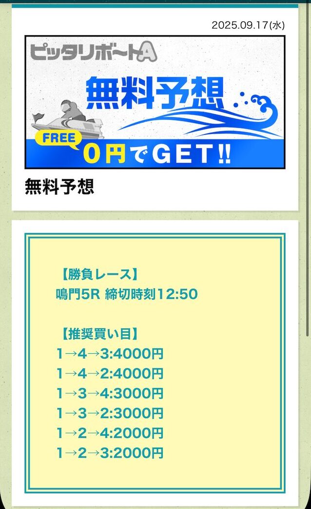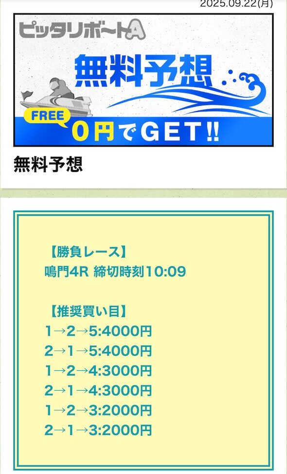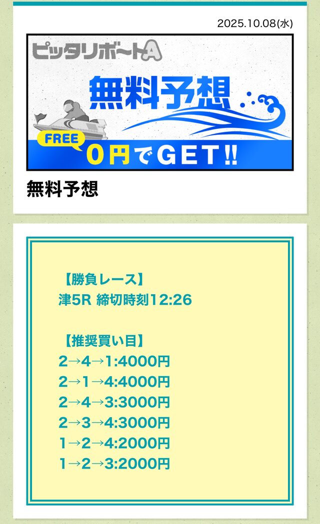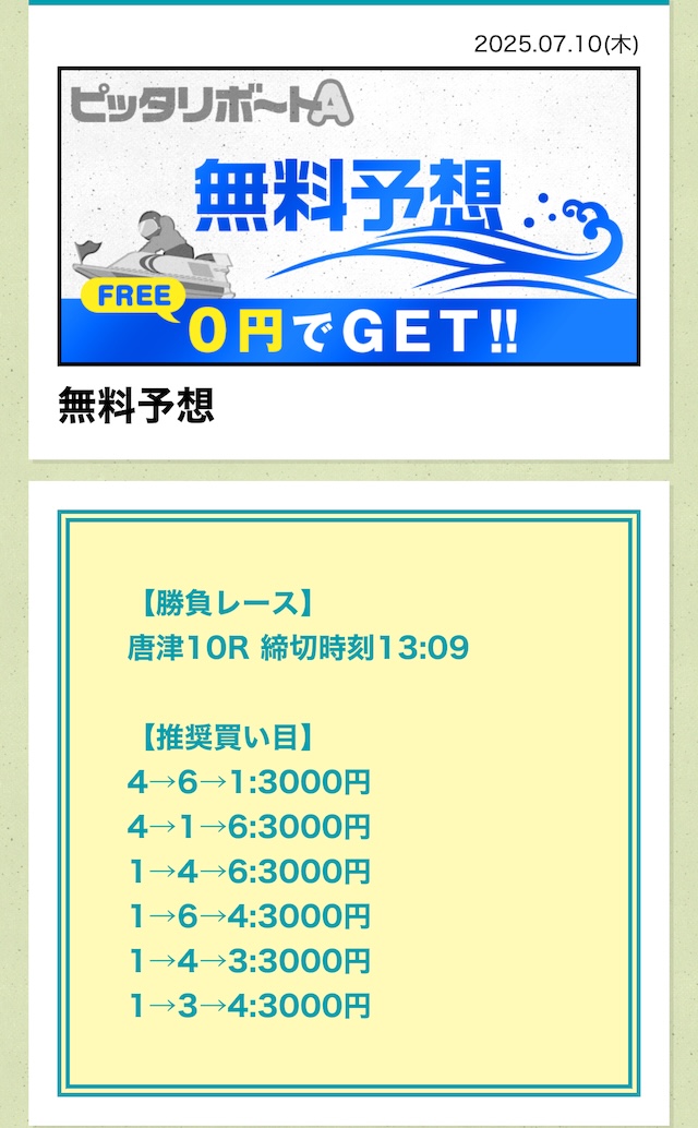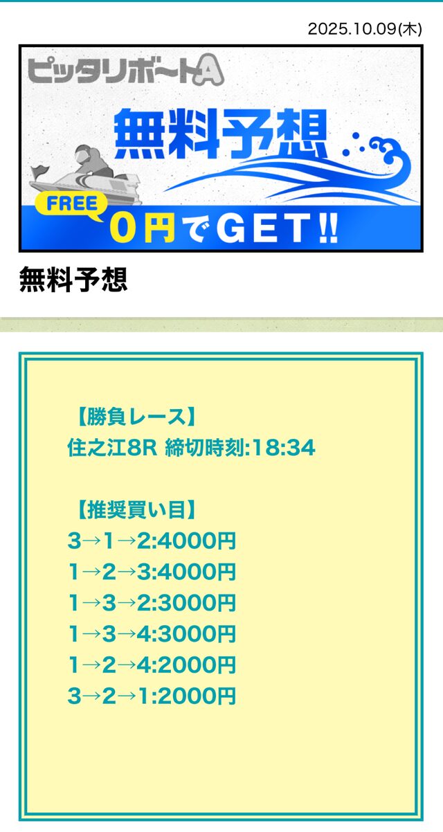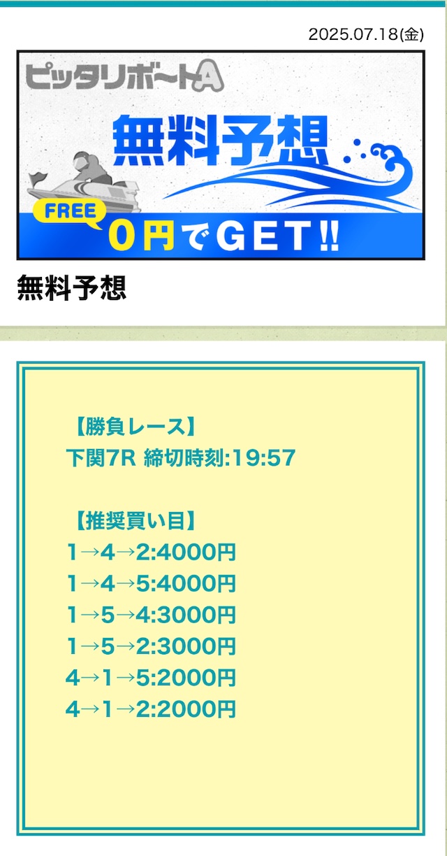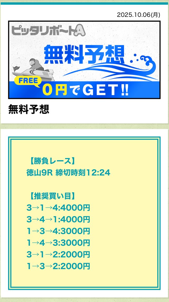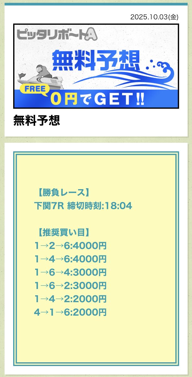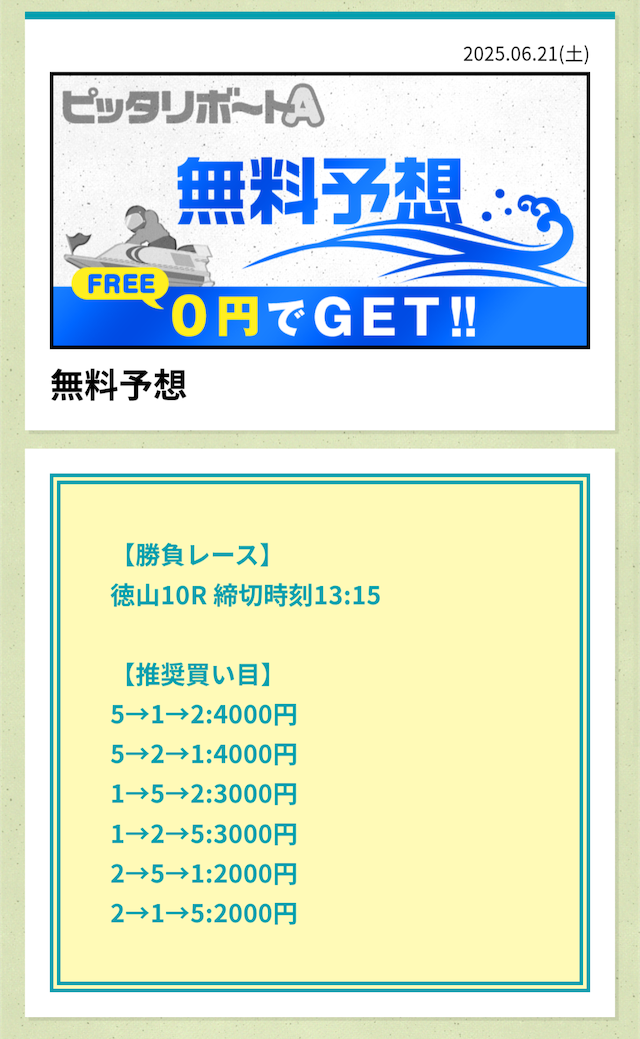 最近で一番回収できたのがここの無料予想。直前配信だから展示や気配も反映されてるし、3連単6点構成で買いやすい。1号艇決着だけじゃなく2号艇絡みも拾えてて、トリガミもなし。3日で+18,000円だった。