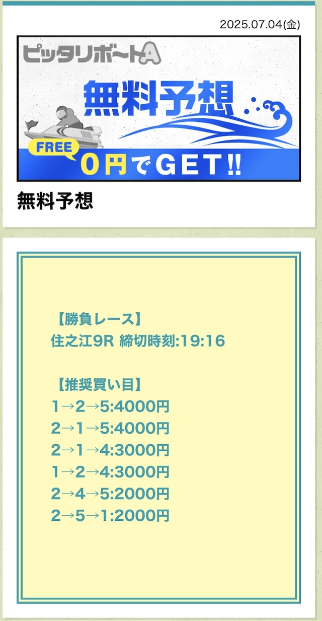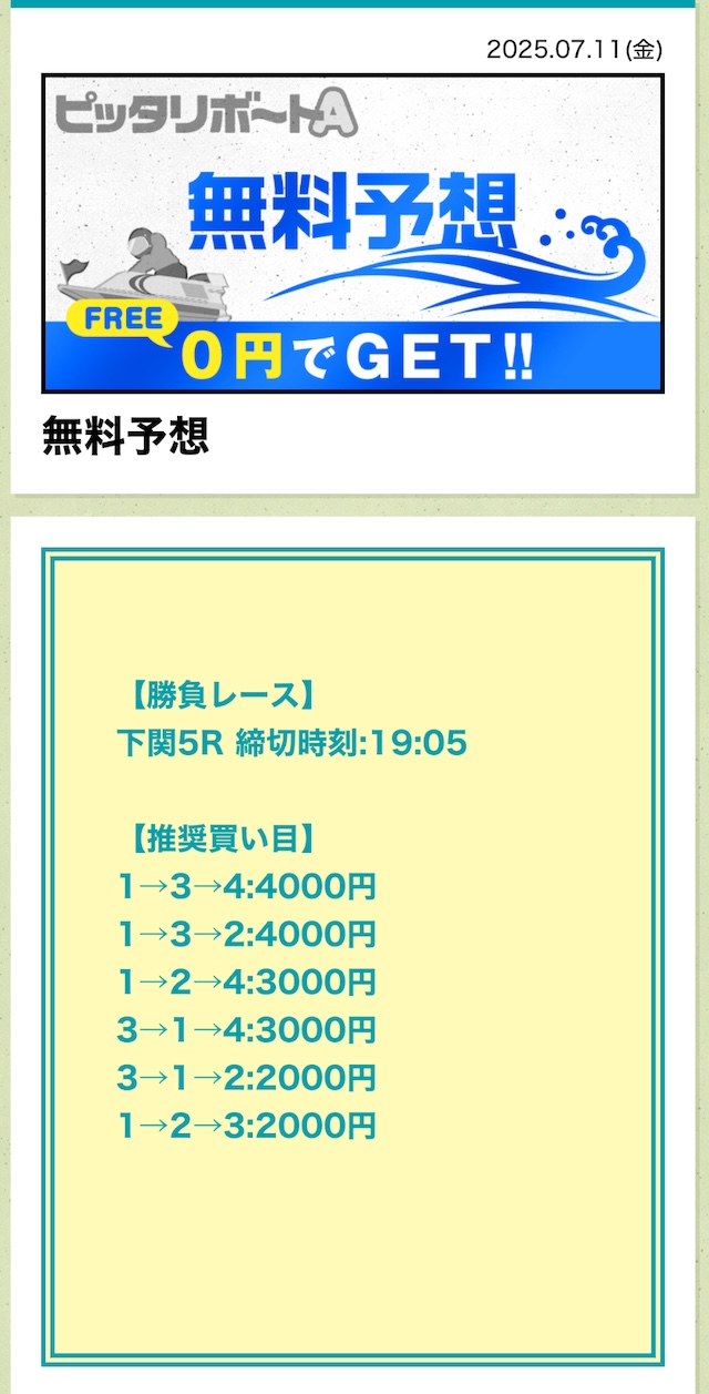 情報重視っていうだけあって、展開の読みがしっかりしている印象でした。1点あたり2,000円以上で資金配分も明記されてたので、信頼して買えました。無料で回収率重視は珍しく、実際にプラスにできたのが嬉しかったです。
