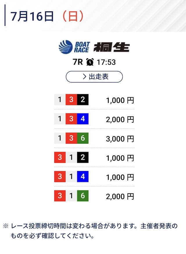 - 11月16日 桐生6R【買い目】三連単1-2-44.2倍12,600円 - 10,000円= 2,600円126%