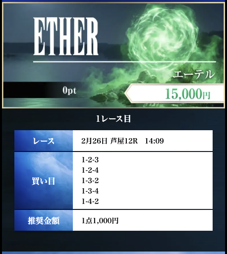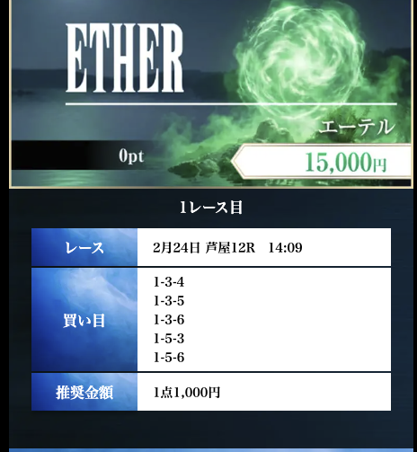 - 2/12 芦屋10R三連単 5点1−2−6獲得金額17,000円投資金額5,000円17倍+12,000円