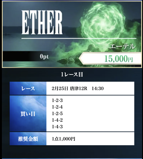 - 2/25 唐津12R三連単 5点1−4−2獲得金額19,300円投資金額5,000円19.3倍+14,300円