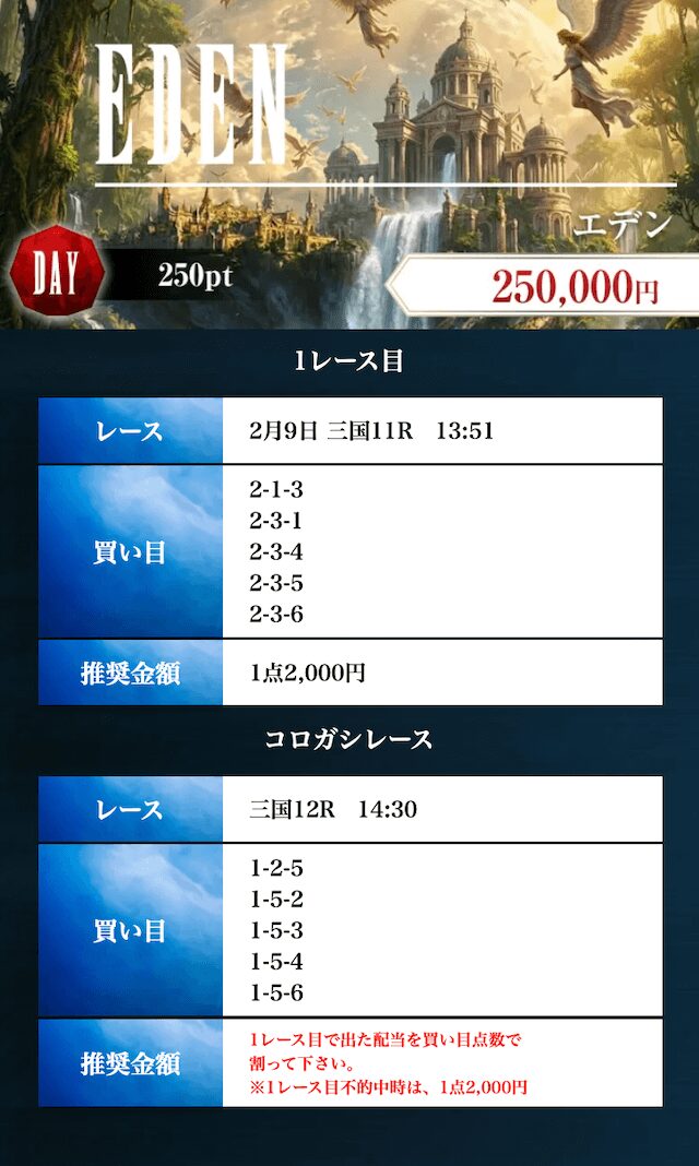 | エデン | 25,000円 | 10,000円(3連単) | 25万円前後 | 714% |