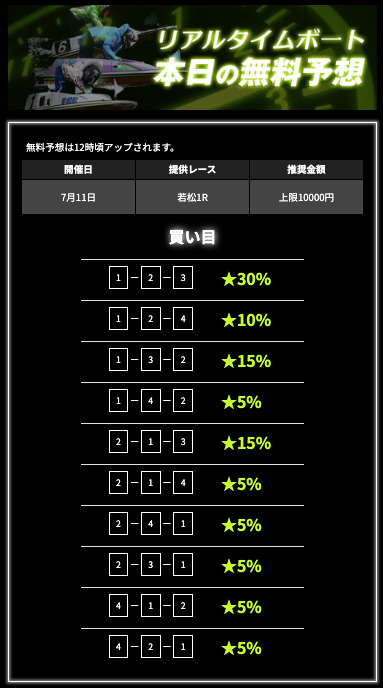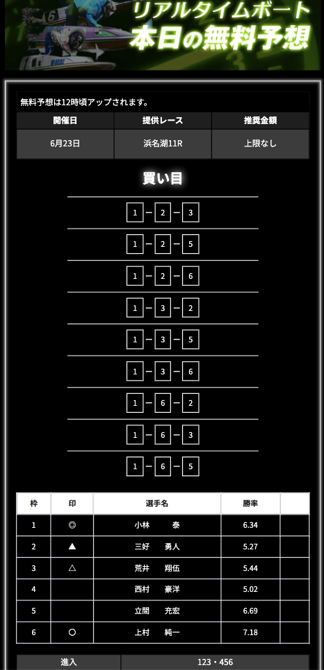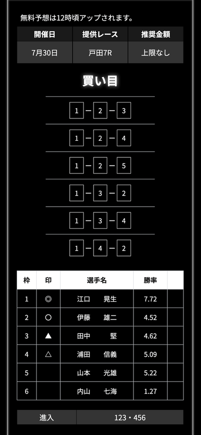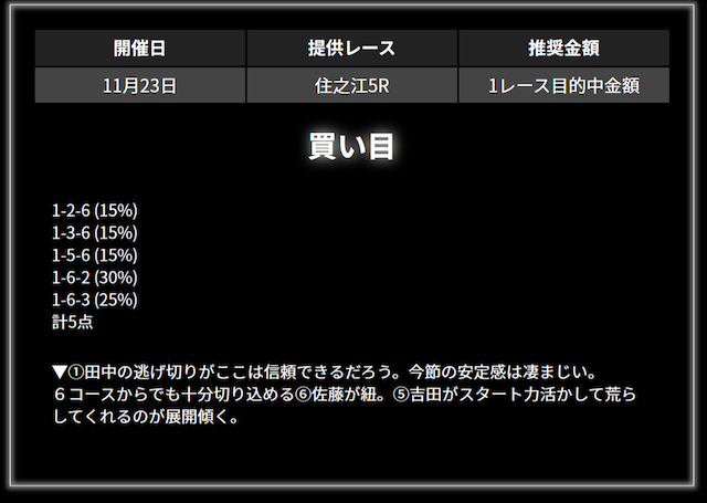 POINTポイント①.本命決着でも数万のプラスを出せる!ポイント②.一撃で帯まで見える有料予想!ポイント③.7点予想で連勝できる展開予想力!- コロ助昨日の無料が宮島で6万1200円の払い戻し出してくれて 今日11月27日は昼の無料が浜名湖で6万7200円、夜は蒲郡で31万5200円も無料情報が当ててくれた