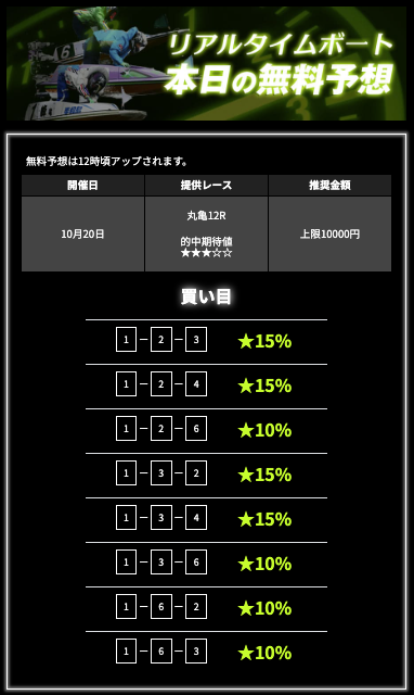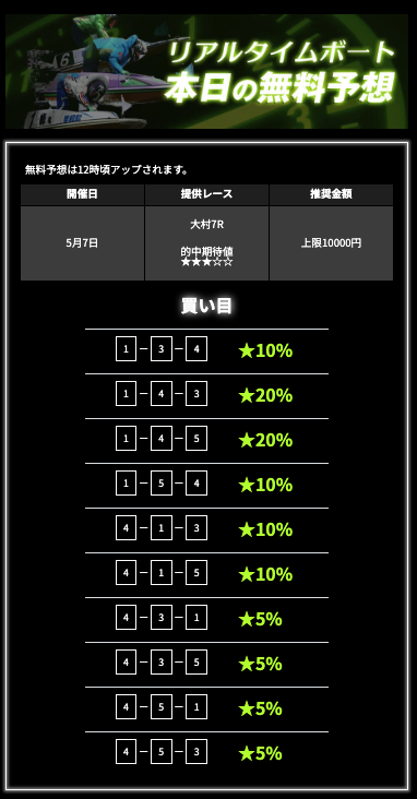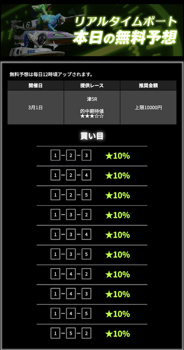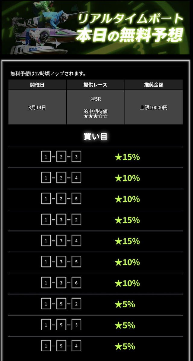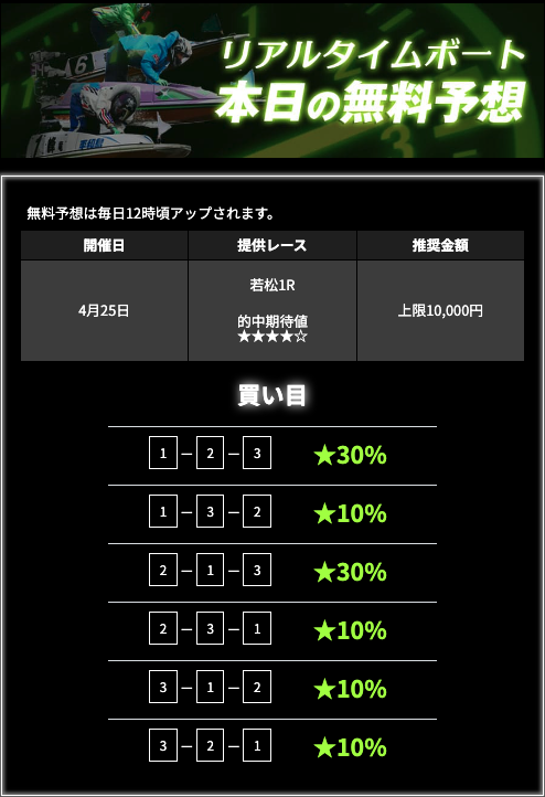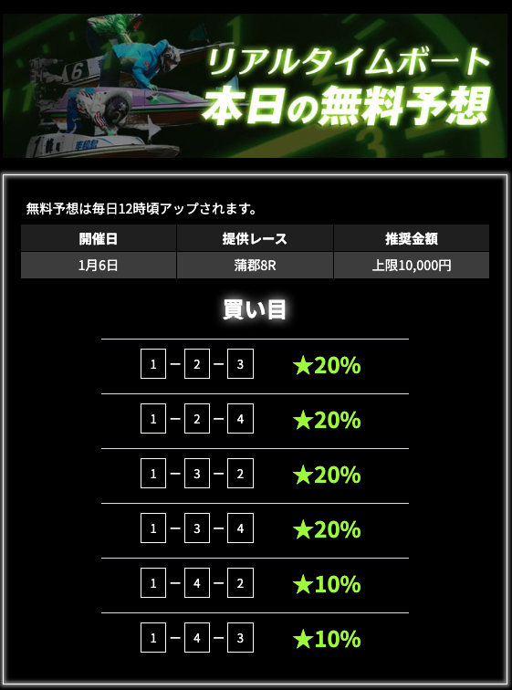 リアルタイムボートの無料予想を半年利用していますが、収支はずっと右肩上がりです!的中率は70%前後、十分凄いのですが、稼げている要因は回収率が高い事だと思います!2連敗、3連敗くらいでしたら1回の当たりですぐに取り返してくれます!時にはトリガミなどもありますけど、高い配当が当たると一気に勝てるので重宝しています!