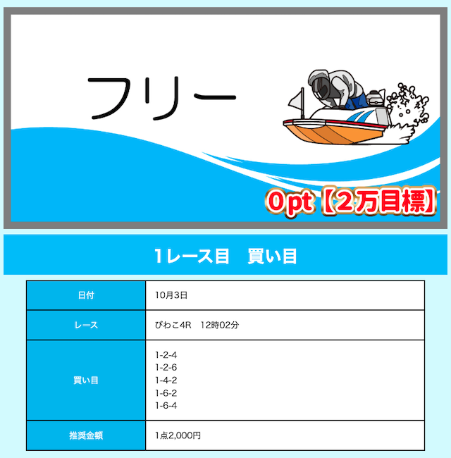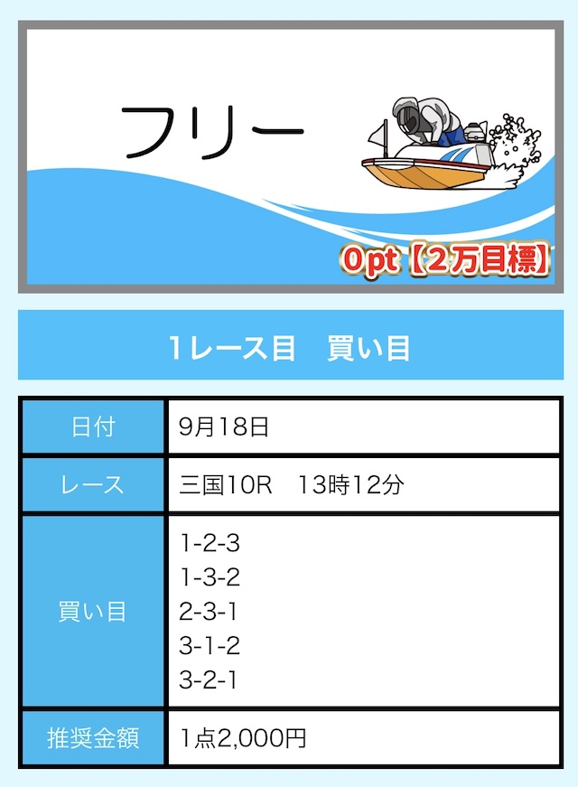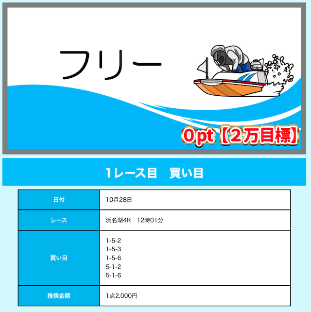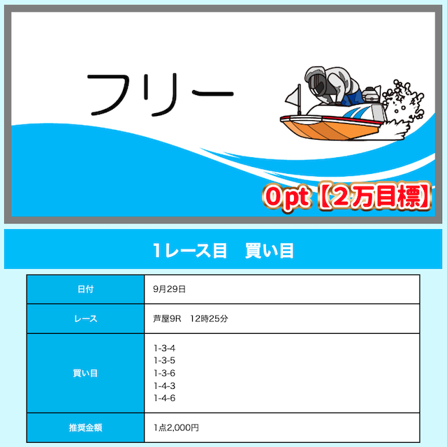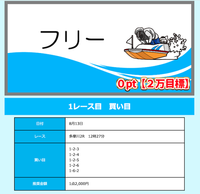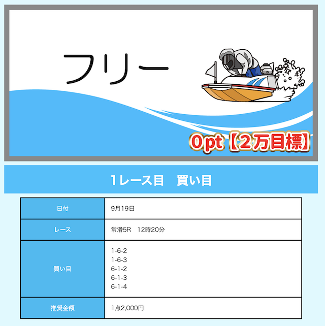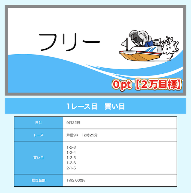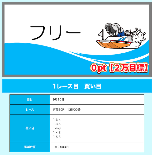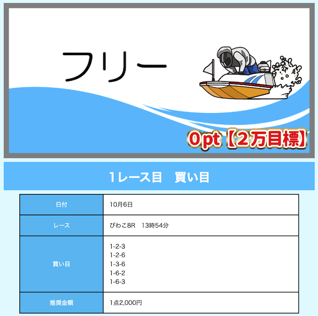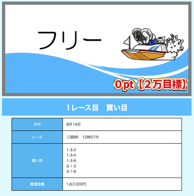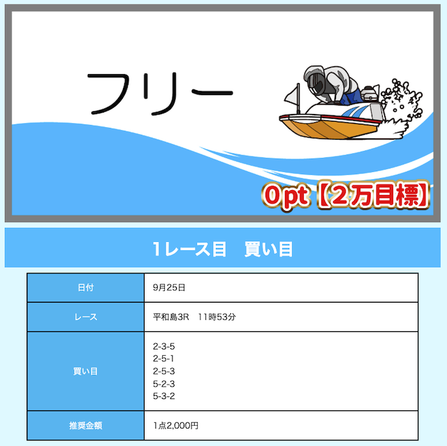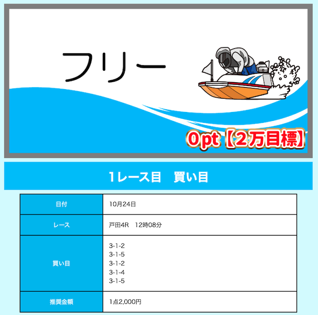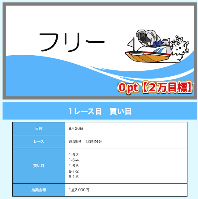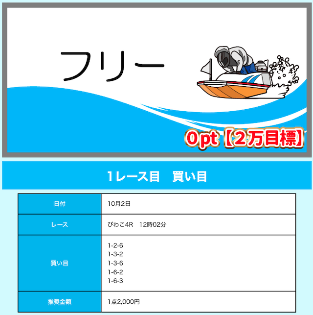 1号艇軸で堅いかと思いきや、2着3着の荒れ展開をしっかり当ててくる。これが無料?って思うくらい配当が取れた。5点構成だし、無駄がないのも◎。実際に1レースで2万超えたこともある。