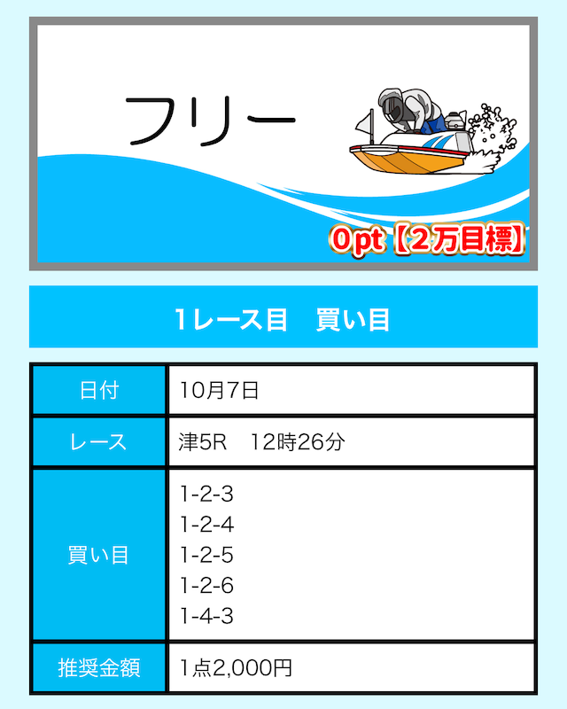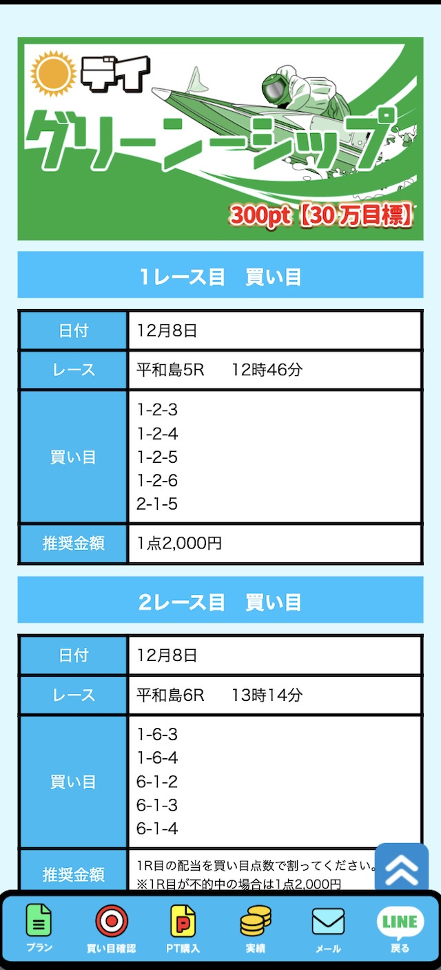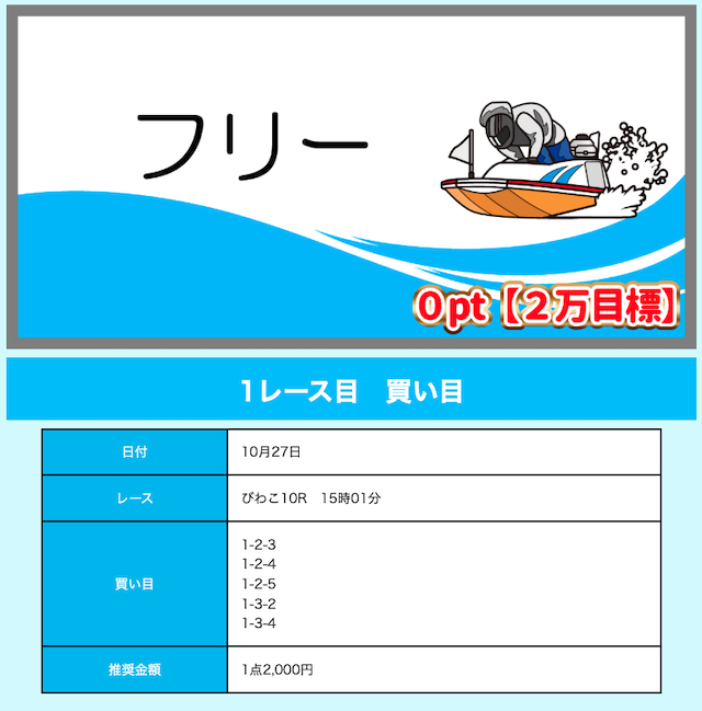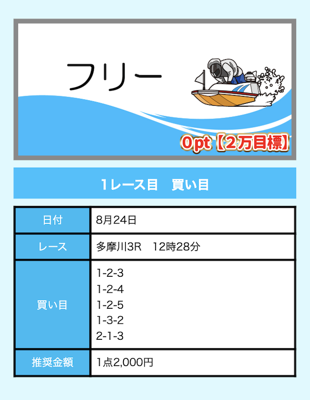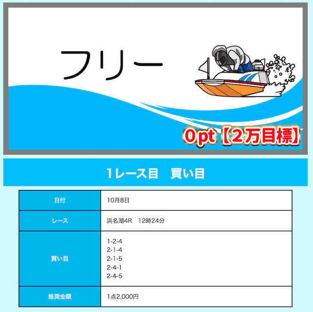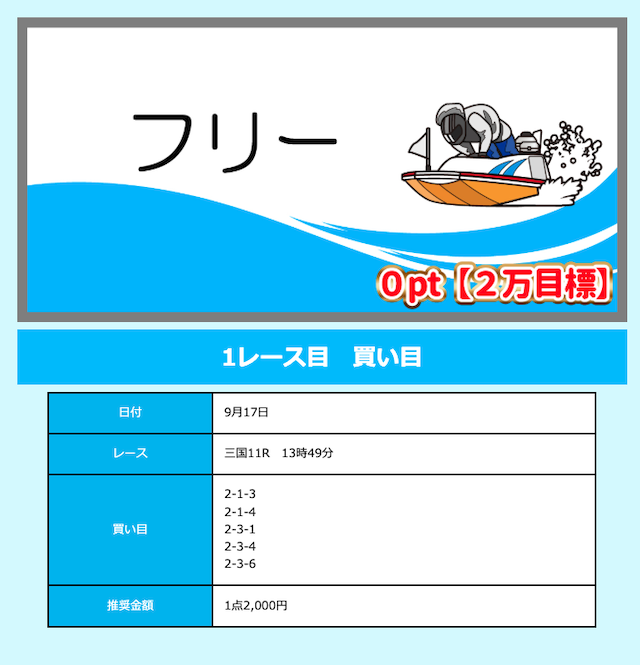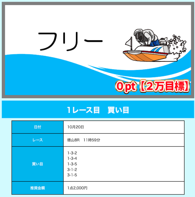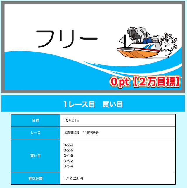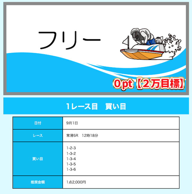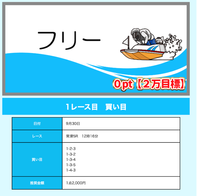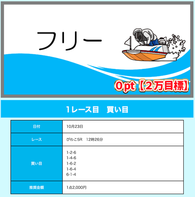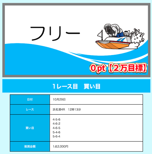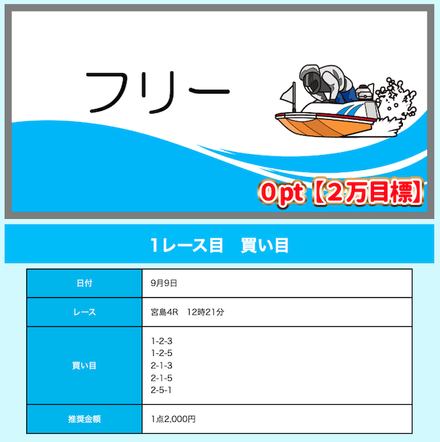 1号艇軸で堅いかと思いきや、2着3着の荒れ展開をしっかり当ててくる。これが無料?って思うくらい配当が取れた。5点構成だし、無駄がないのも◎。実際に1レースで2万超えたこともある。