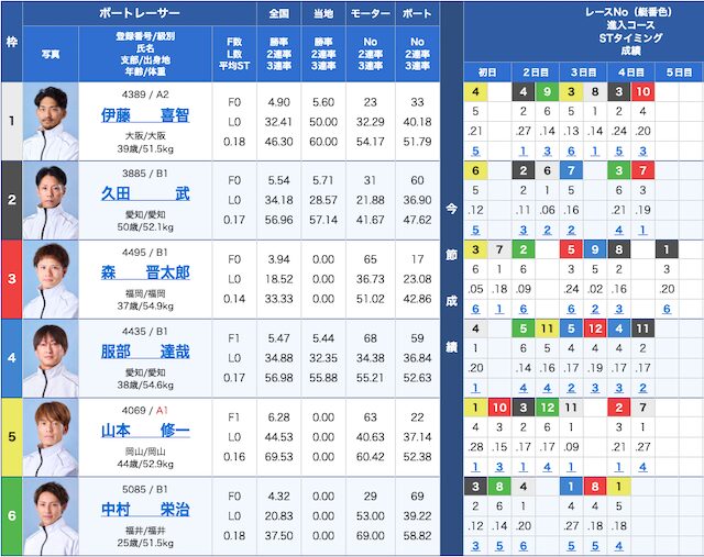 6コースの山田雄太選手はアウト枠ながらA1級で調子も良く、展開次第では差し切り勝ちも可能な実力者です。