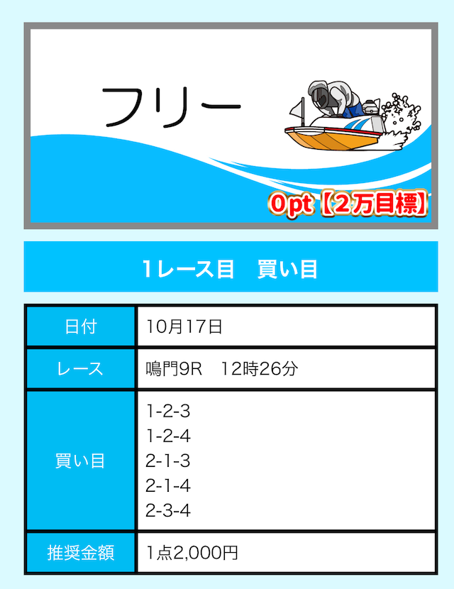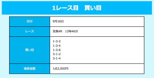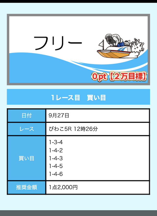 点数が少ないのは良いけど、外れたときのダメージが大きい。1号艇軸が飛んだら終了パターン。精度が高いならいいけど、2レースやって結果が出なかったのでちょっと不信感。