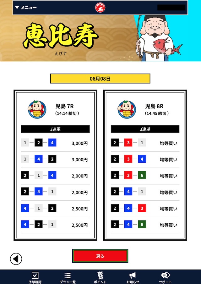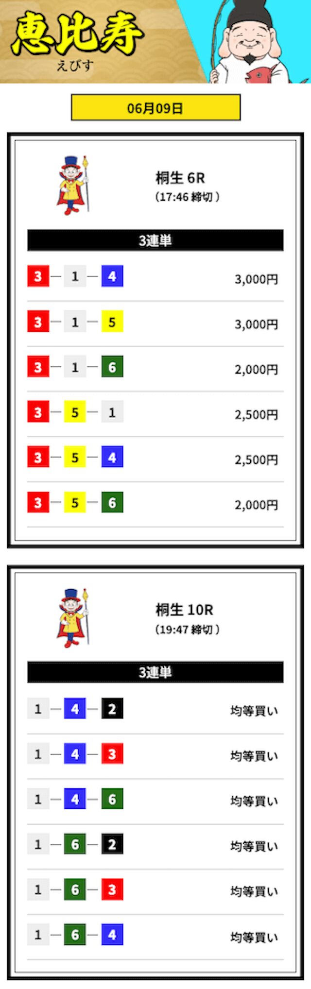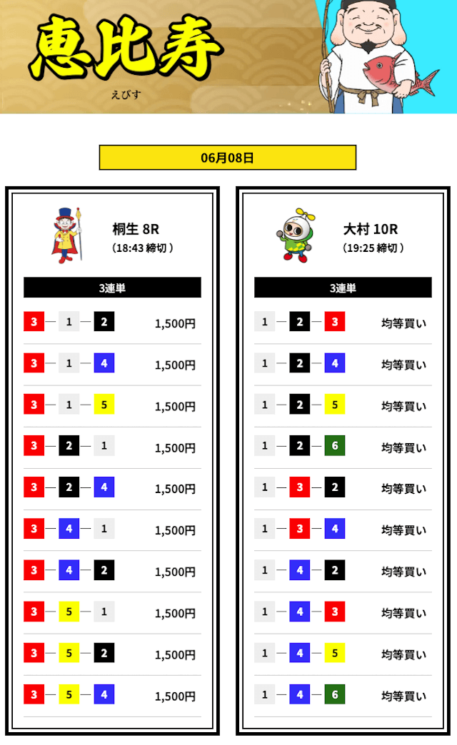 おすすめする「恵比寿」は船客万来が公開する有料予想の中で比較的、高額な資金を賭けずに大金を得られます。