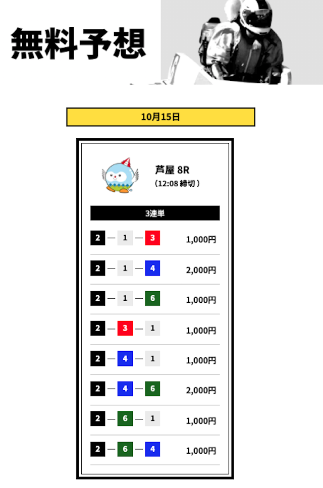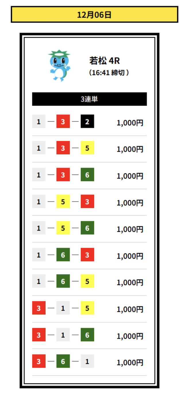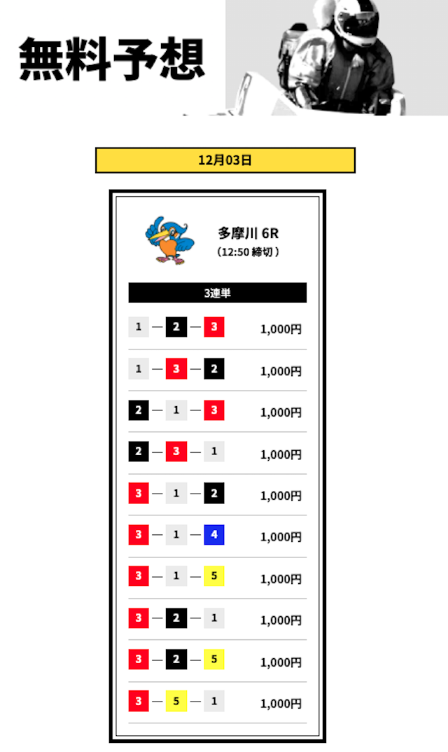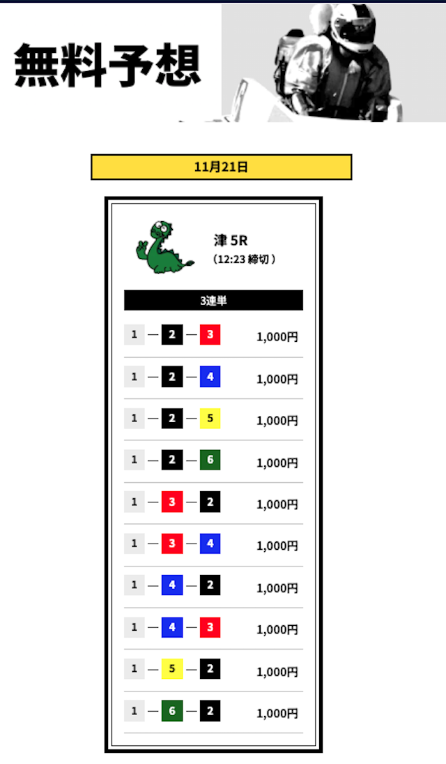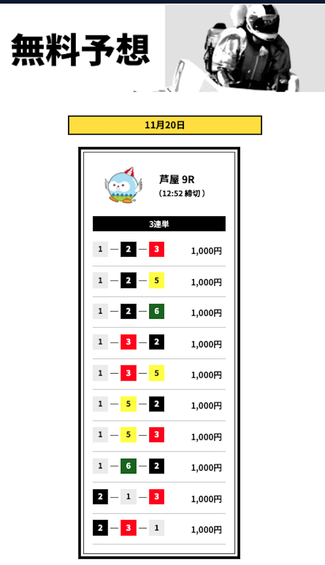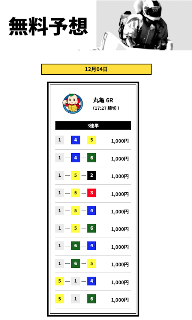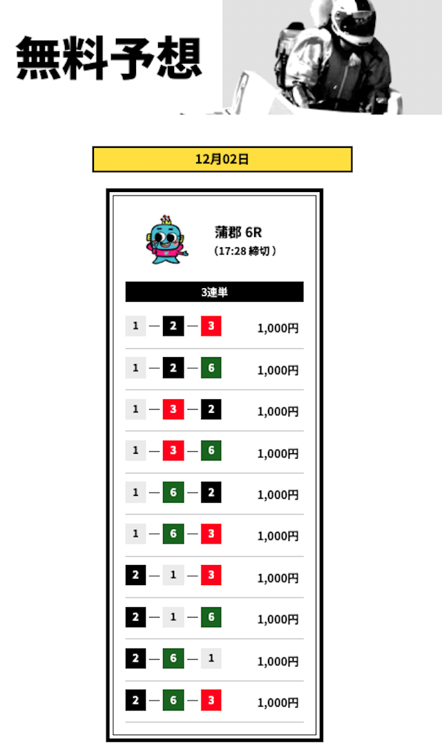 最初は1号艇絡みの堅い買い目ばかりかと思っていたが、意外とヒモ荒れや展開読みも鋭くて、印象が変わった。6号艇が突っ込んできたレースを当てられたのは正直感動もの。点数はそこそこあるけど、そのぶん外しづらいから、長く付き合えそう。
