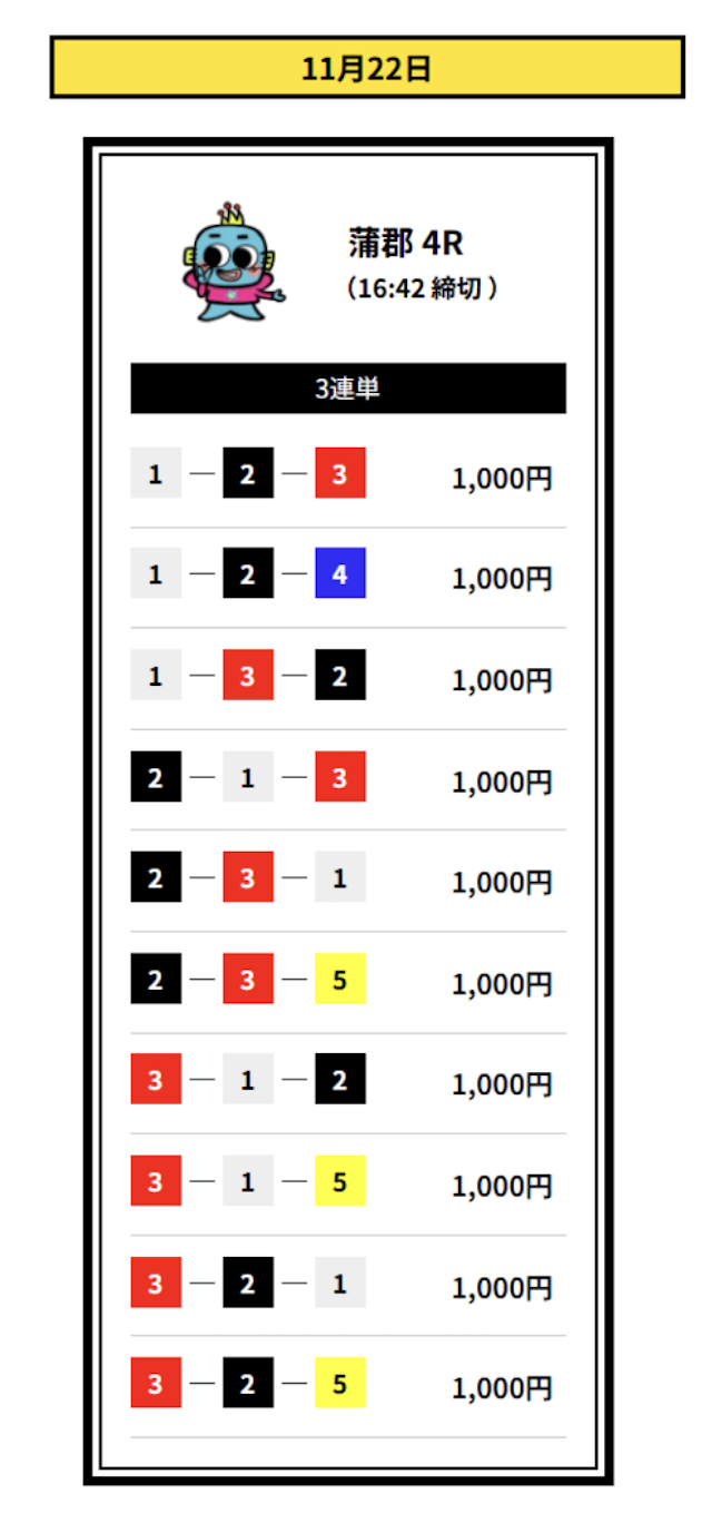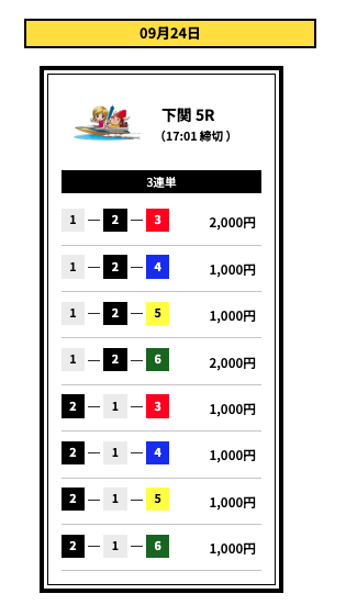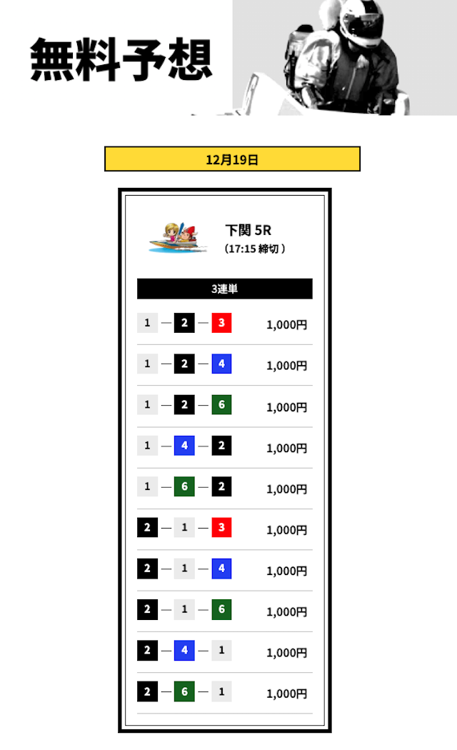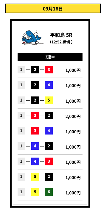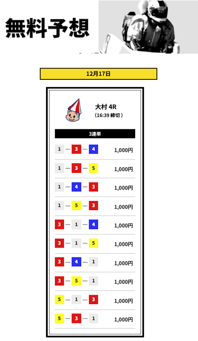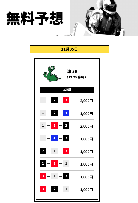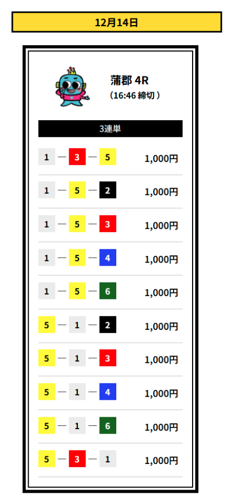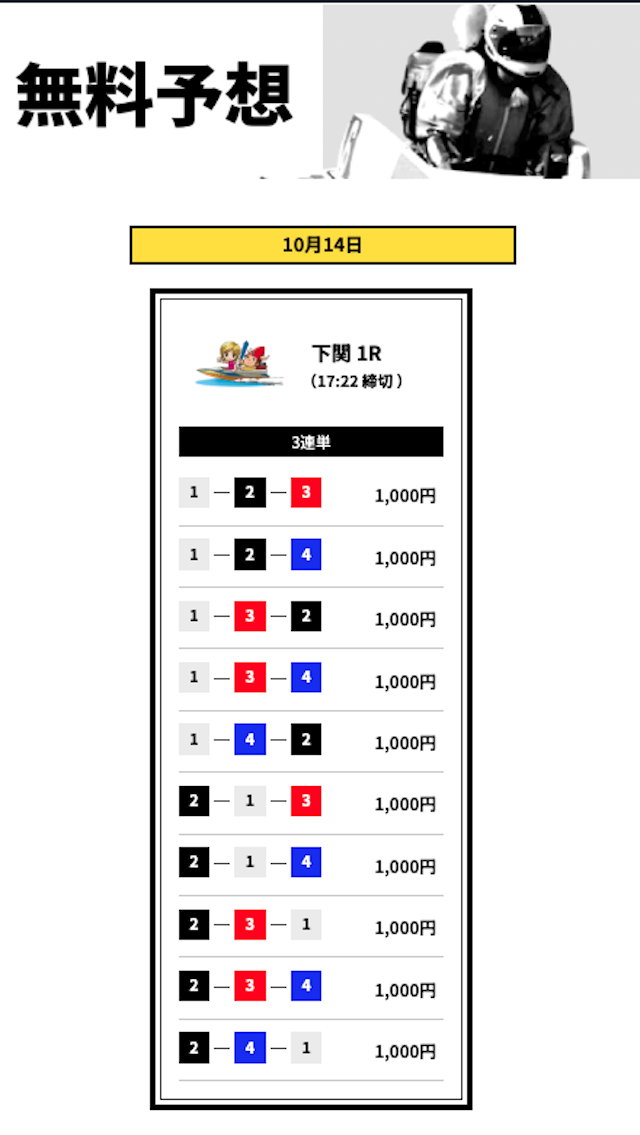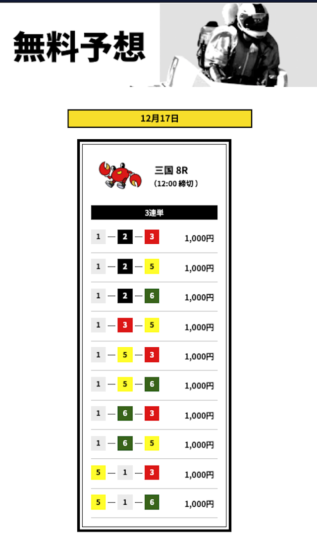 最初は1号艇絡みの堅い買い目ばかりかと思っていたが、意外とヒモ荒れや展開読みも鋭くて、印象が変わった。6号艇が突っ込んできたレースを当てられたのは正直感動もの。点数はそこそこあるけど、そのぶん外しづらいから、長く付き合えそう。