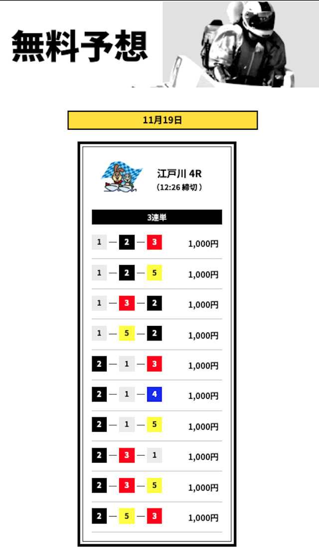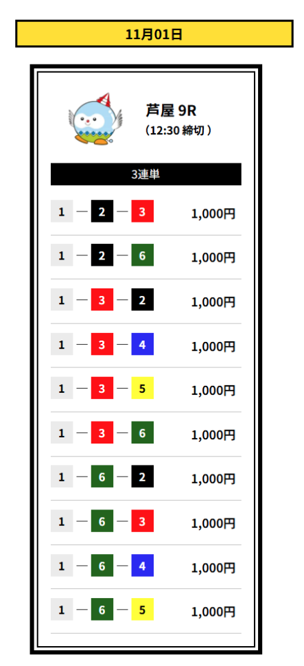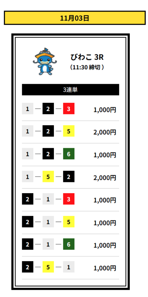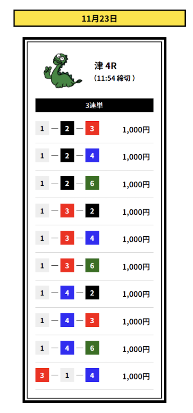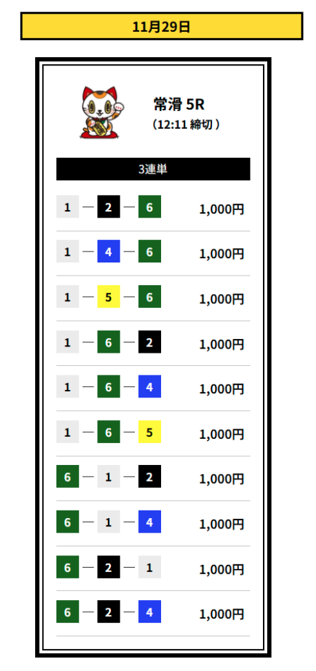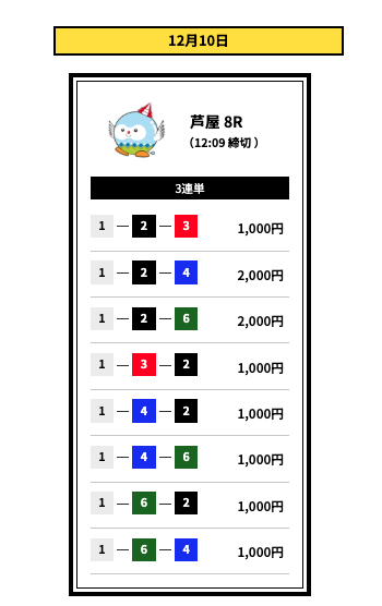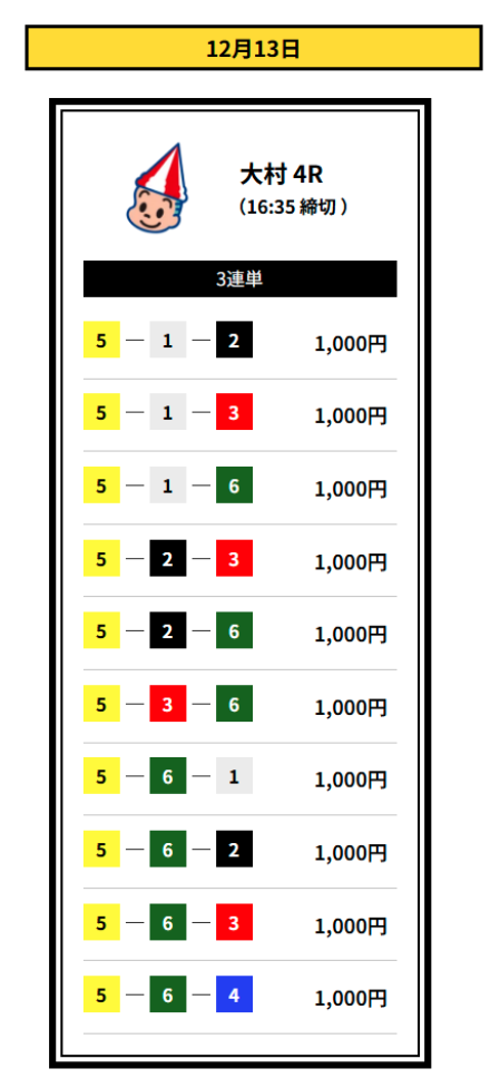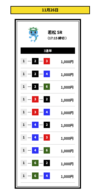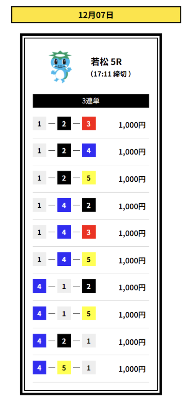 最初は1号艇絡みの堅い買い目ばかりかと思っていたが、意外とヒモ荒れや展開読みも鋭くて、印象が変わった。6号艇が突っ込んできたレースを当てられたのは正直感動もの。点数はそこそこあるけど、そのぶん外しづらいから、長く付き合えそう。