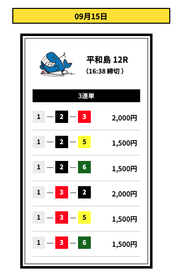 | 6月10日 | 平和島5R | 60,000円 | 15,000円 | 86,500円 | ◯ |