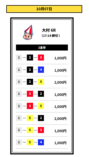 | 6月8日 | 大村10R | ‐ | ‐ | 644,670円 | ◯ |