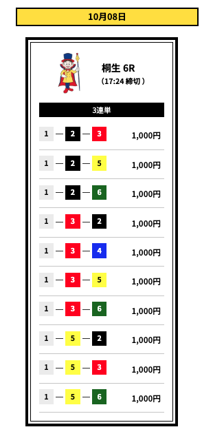 | 6月9日 | 桐生6R | 50,000円 | 15,000円 | 126,000円 | ◯ |