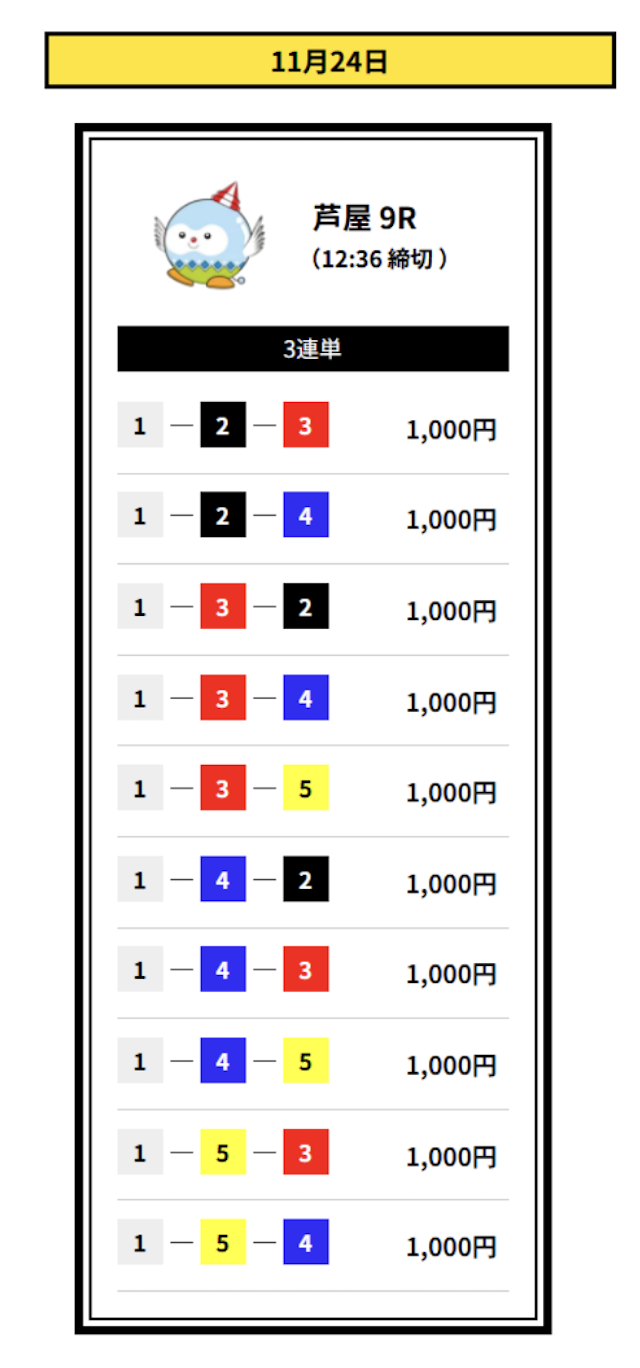 外れないのはいいけど、勝っても金額がそこまで跳ねないからテンションは上がらない。競艇は娯楽の側面もあるので、ちょっと物足りなさを感じてしまった。悪くないけど、強くはおすすめできないかな。