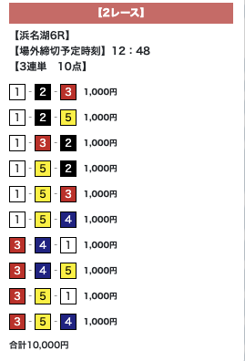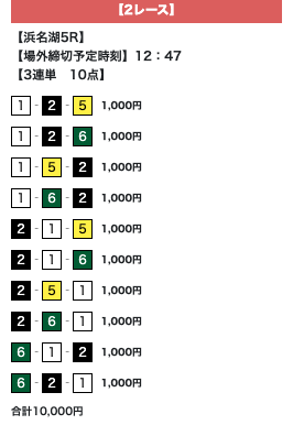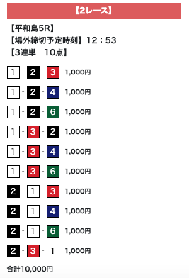 3号艇の平本選手をどう含めるかが重要ですが、千両舟はどのように予想したのか買い目を見ていきましょう。