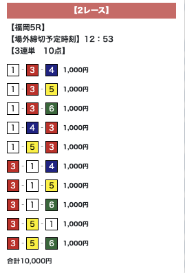 買い目は特別絞れていない印象。たまに「それは入れなくてもいいだろ」って組み合わせもあるから予想を任していいか分からない時がある。