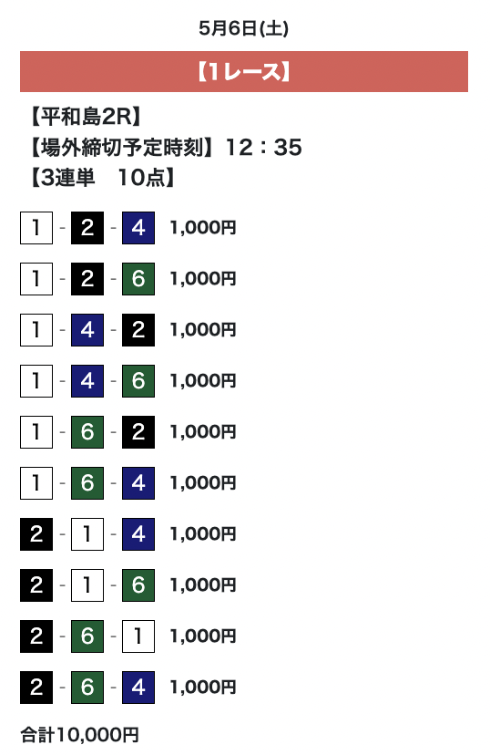 - 5月15日 平和島6R【買い目】三連単1-6-321.2倍21,200円 - 10,000円= 11,200円212%